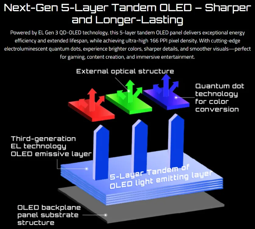 Поворотный момент для W-OLED в 2025–2026 — это Tandem WOLED / Primary RGB Tandem (то, что в маркетинге некоторых мониторов называют «4th Gen OLED»). Вместо прежней трёхслойной конструкции, где два слоя приходились на синюю эмиссию, а один комбинированный слой отвечал за красную, зелёную и жёлтую составляющие спектра, вводится четырёхслойная структура Primary RGB Tandem. В ней синяя часть представлена двумя слоями, а красная и зелёная получают собственные отдельные слои.