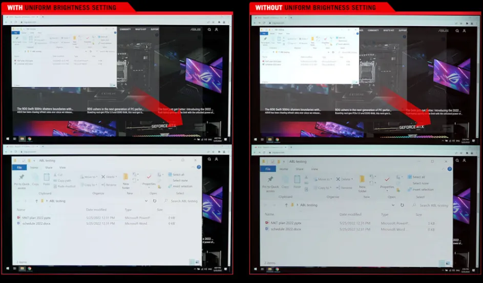 Во-первых, это ABL/ASBL. Технология ABL (Average Brightness Limiter) ограничивает яркость на больших светлых заливках, чтобы удержать тепловой режим и повысить ресурс панели. Пользователь видит это как падение яркости, когда открывает белое окно на весь экран, или как лёгкое «дыхание» при смене сцены в кадре. Во многих актуальных решениях, до сих пор, есть функции стабилизации яркости, ограничивающие максимальный световой поток, но снижающие почти до нуля флуктуации яркости — это крайне полезно для снижения стресса пользователя — без шуток. Впрочем, чем новее OLED-панель, тем меньше таких проблем.