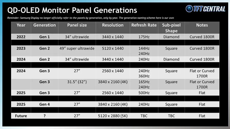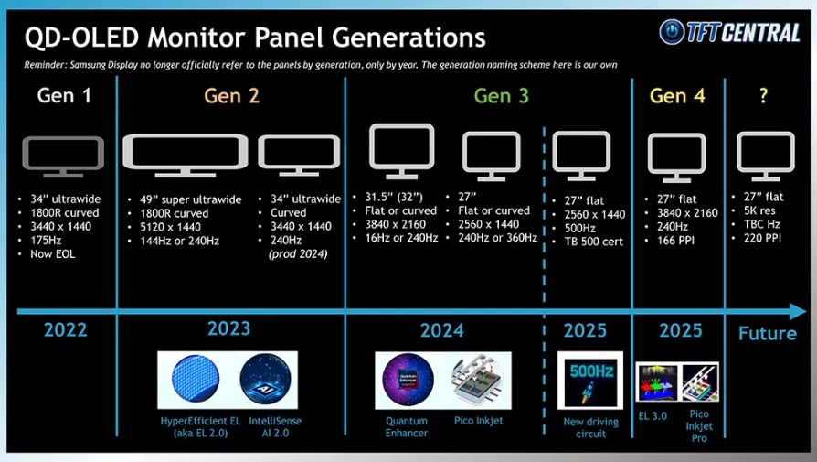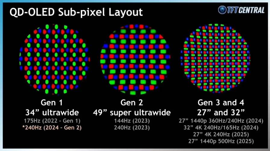 В 2025-ом компания Samsung представила QD-OLED Gen 4. Здесь ставка была сделана на появлении первых 27-дюймовых 4K UHD c частотой 240 Гц, увеличении максимальной частоты развёртки до 500 Гц в случае WQHD (по своей сути это поколение Gen 3.5) и повышение показателей яркости, за счёт очередных улучшений эмиссионного слоя — применения тандемных стеков.