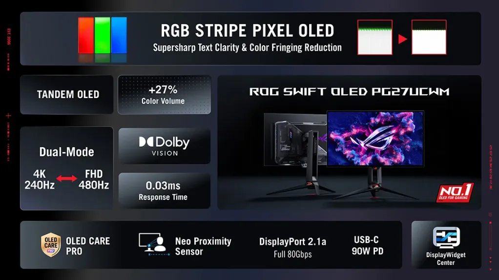 Самый последний тренд 2026-го для W-OLED — переход к RGB-Stripe архитектуре в классе 27-дюймовых 4K 240 Гц — Gen 5. Это фактически прямой ответ на всю пользовательскую критику про чёткость и проработку шрифтов и мелких элементов на всех W-OLED четырёх предыдущих поколений. Одна проблема — подобные модели только представлены и должны появиться в РФ ближе к лету этого года. Более того, далеко не всем интересны 4K UHD-мониторы, а поэтому следует ожидать появления более распространённых WQHD-решений с обновлённой архитектурой.