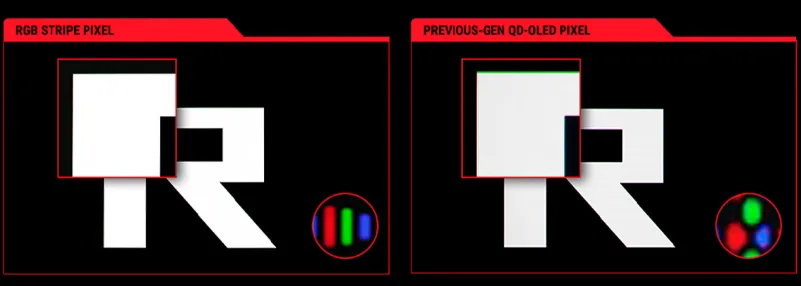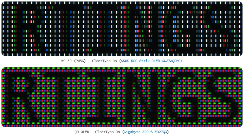 По проработке текста и пользовательских интерфейсов (UI) долгое время обе технологии могли раздражать, но просто по-разному: QD-OLED из-за нестандартной геометрии субпикселей ранних панелей, WRGB-W-OLED из-за нестандартного положения RGB-субпикселей и дополнительного — четвёртого цвета (белый субпиксель) в схеме. С 2024 года у новых QD-OLED проблем стало явно меньше, а с 2026-го оба производителя OLED-панелей единогласно пришли к одному и тому же выводу: для настольного монитора нужна более «ПК-дружелюбная» структура (V-Stripe у QD-OLED и RGB-Stripe у W-OLED).