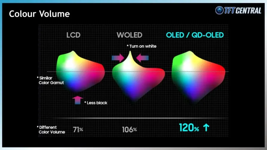 Если смотреть именно на картинку для воспроизведения HDR и на цветовую насыщенность в целом, то QD-OLED чаще даёт более сильный «цветовой объём» (Color Volume). Последние поколения Tandem W-OLED добрались до уровня QD-OLED, но подобное поведение новинок можно наблюдать только на высоких уровнях яркости. Что же касается трёх предыдущих поколений W-OLED, то всё они в проигрыше.