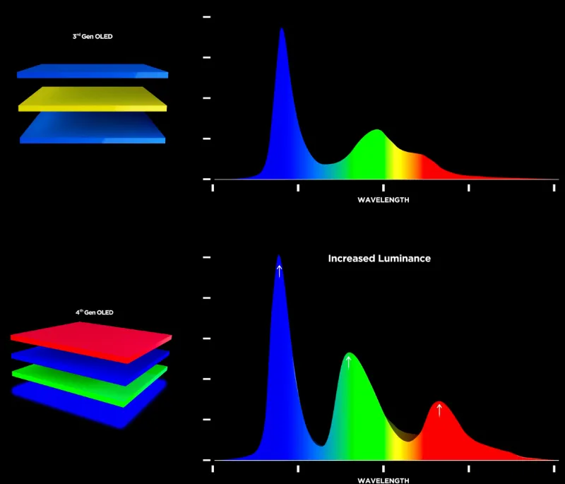 Смысл здесь не в красивом названии, а в росте эффективности: панель получает больше света на ватт, и у производителя появляется выбор. Можно поднять потолок яркости, можно ослабить падение яркости на больших заливках, можно удерживать режимы стабильнее по времени. Кроме того, спектр свечения становится более правильным («универсальным»), расширяется цветовой охват и цветовой объём в широком диапазоне яркостей — новые панели максимально приблизились к показателям актуальных QD-OLED.