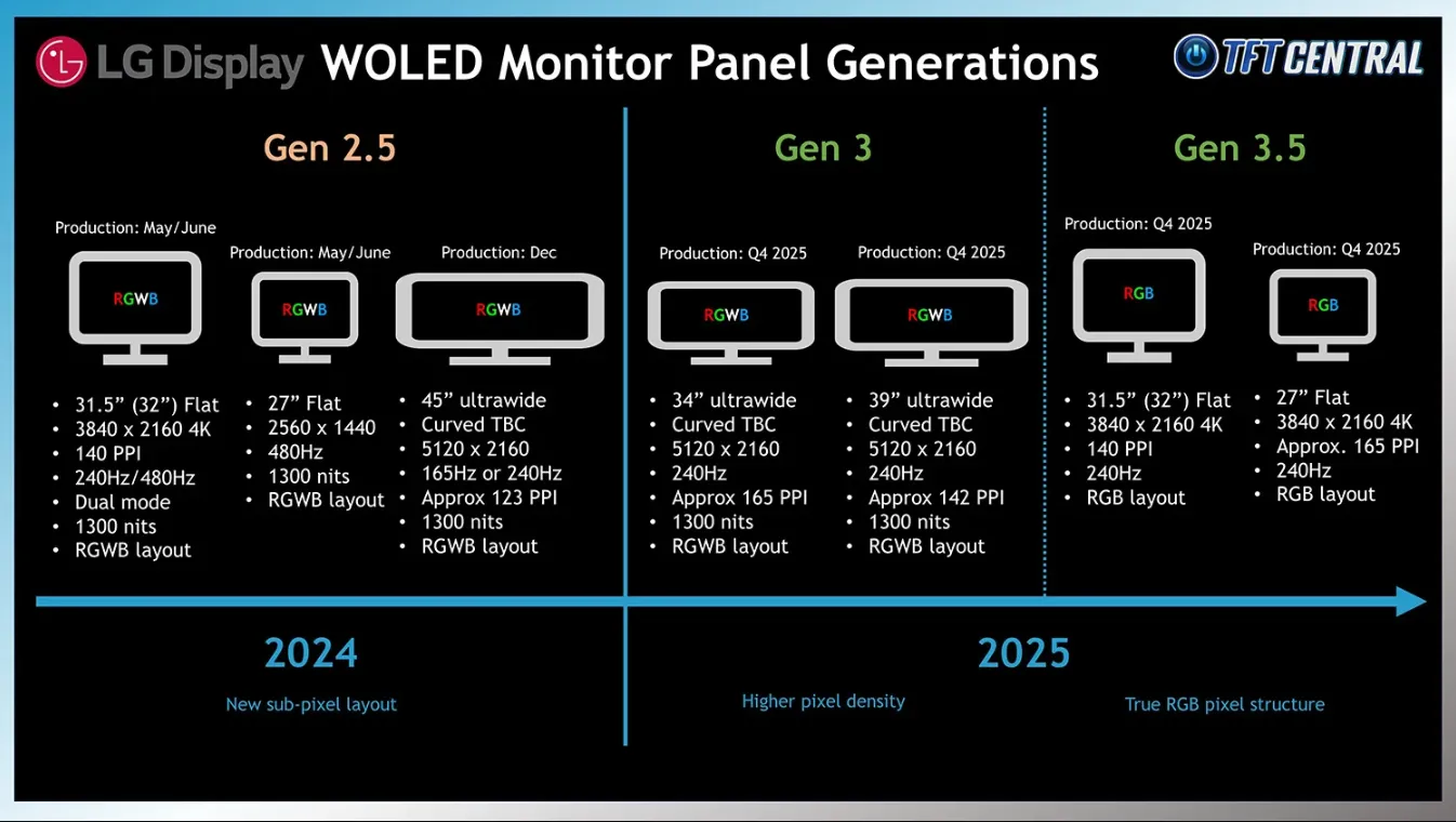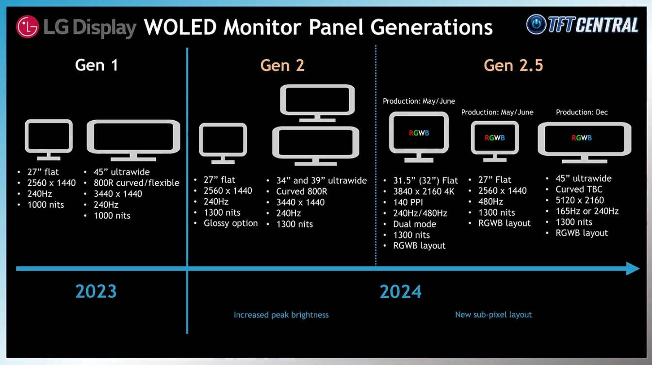 Ближе к началу 2024 года появились первые крупные 4К UHD панели с высокой частотой 240 Гц, различные UWQHD-модели, а также стали появляться решения с режимом Dual-Mode, в котором при понижении разрешения до Full HD можно было удвоить рабочую частоту — условно это W-OLED Gen 2 и Gen 2.5.