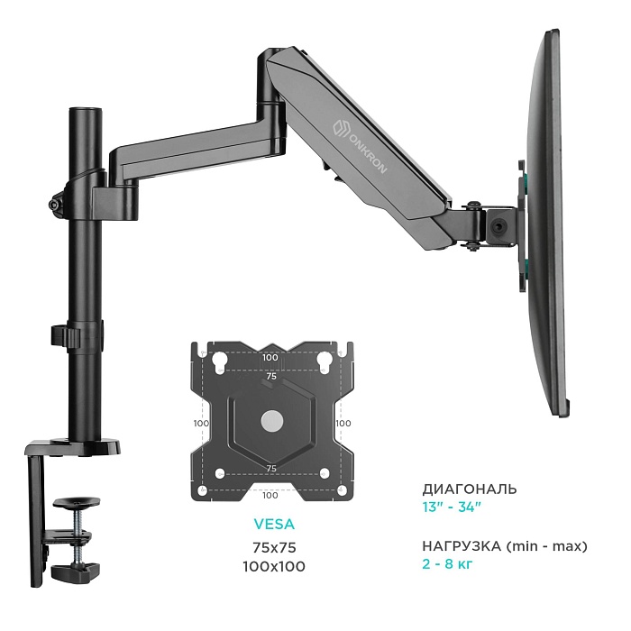 ONKRON G70 - настольный наклонно-поворотный кронштейн для монитора, выполненный по технологии газлифт, ONKRON G70 подходит для мониторов и телевизоров диагональю от 13 до 34 дюймов (33,02-86,36 см) и весом от 1 до 8 кг. G70 поддерживает стандарты крепления VESA 75×75, 100×100 mm. Механизм с возвратной пружиной и газовым амортизатором, располагающийся внутри корпуса кронштейна, даст возможность легко перемещать монитор в любую нужную вам позицию. Прочная конструкция из алюминия надежно его удержит.