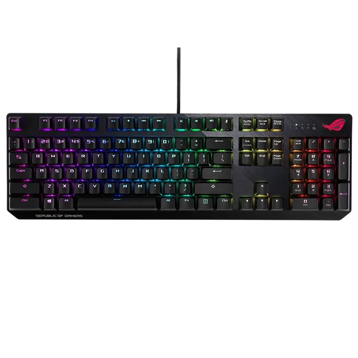 ROG Strix Scope NX – это яркая клавиатура, ведь она снабжена красочной подсветкой Aura, настраиваемой индивидуально для каждой клавиши. Выбирайте среди бесчисленного количества цветовых оттенков и нескольких динамических визуальных эффектов, а также синхронизируйте работу подсветки с другими Aura-совместимыми устройствами.