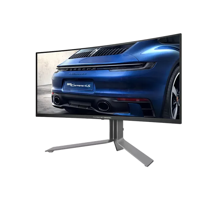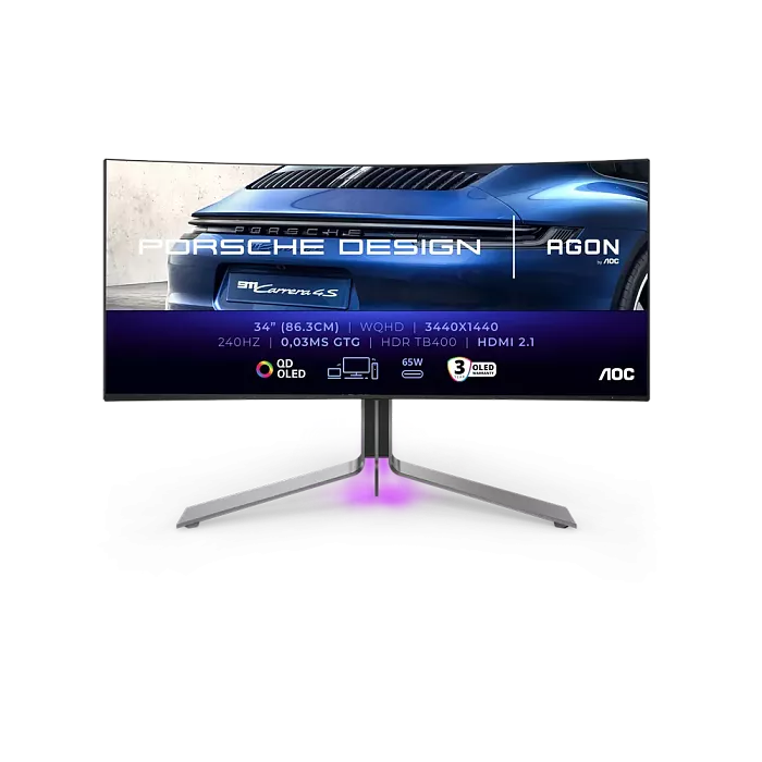 AOC AGON PRO PD34 Porsche Design оснащен ультрашироким изогнутым экраном на базе матрицы QD-OLED с радиусом кривизны 1800R. Экран имеет диагональ 34 дюйма, формат 21:9 и разрешение 3440 x 1440 пикселей. Основные характеристики устройства включают частоту обновления в 240 Гц и пиковую яркость в 1000 кд/м². Монитор получил сертификацию VESA DisplayHDR True Black 400 и VESA ClearMR 13000, что подтверждает его высокие стандарты цветопередачи и контраста. Он охватывает 100% цветового пространства sRGB, а также 99% AdobeRGB и DCI-P3, обеспечивая высокую точность изображения.