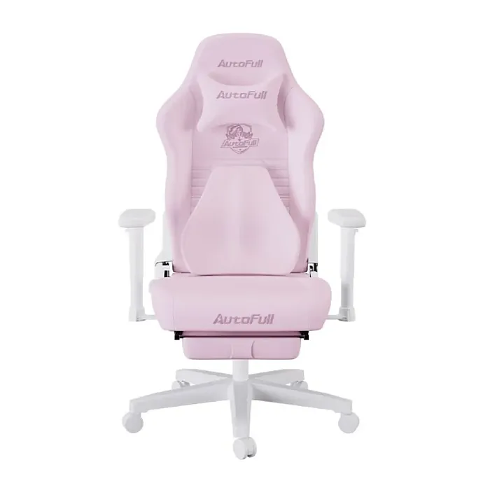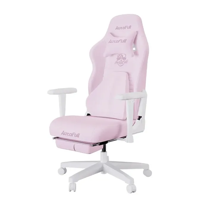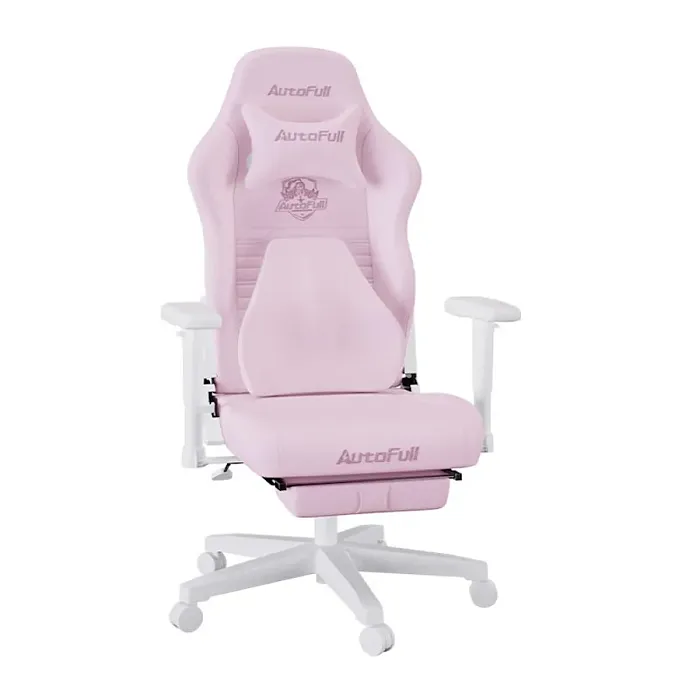 Игровое кресло Autofull C3 с подставкой для ног выполнено из ткани в розовом цвете.