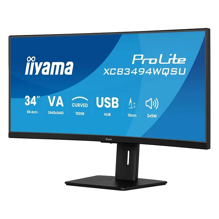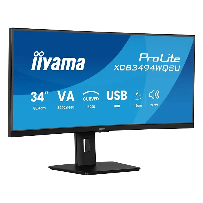 iiyama XCB3497WQSNPH-B1 - 34-дюймовый изогнутый монитор формата UWQHD с матрицей VA, оснащённый встроенной камерой с функцией распознавания лица Windows Hello, микрофоном, разъёмом USB-C для подключения ноутбука, сетевым интерфейсом Ethernet, переключателем KVM для управления несколькими компьютерами одновременно и регулируемой по высоте подставкой.