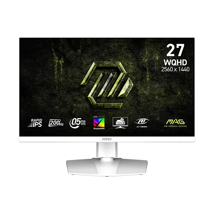 MSI MAG 274QRFW E20 оснащён экраном 2560×1440 (WQHD) с матрицей Rapid IPS, частотой обновления 200 Гц и быстрым временем отклика 0,5 мс (GtG, мин.). Сертификация VESA DisplayHDR 400 улучшает детализацию за счёт регулировки контраста и теней. Подходит для динамичных шутеров, ролевых игр от первого лица, а также авиасимуляторов и гонок.