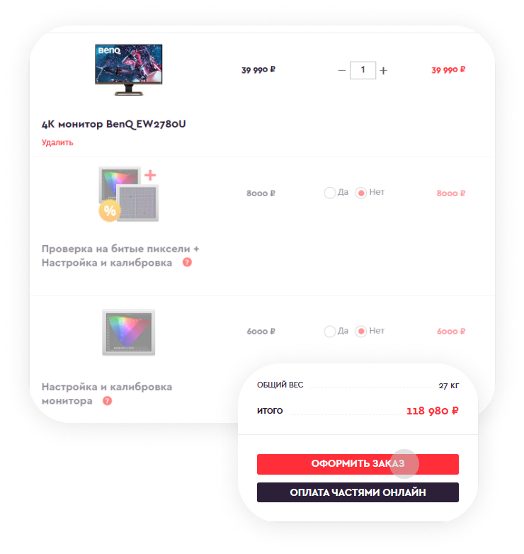 Перейдя в корзину, проверьте список товаров и их количество. Добавьте по желанию дополнительные услуги: