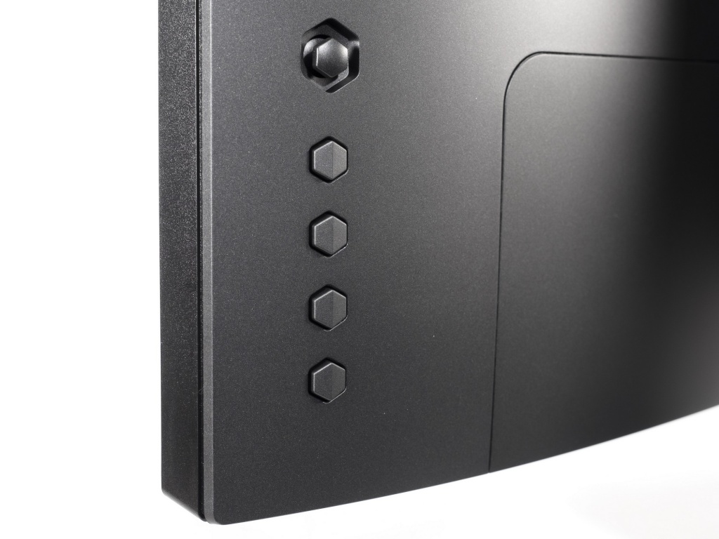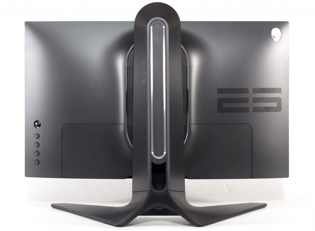 У AW2521HF применён знакомый «безрамочный» дизайн корпуса: всё также присутствует тонкая нижняя накладка, а эргономика подставки максимально возможная для данного класса устройств. Из прочих изменений можно отметить перемещение системы управления на заднюю часть корпуса и, наконец, появление 5-позиционного джойстика.