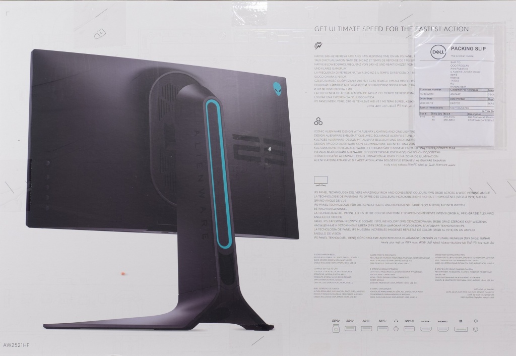 Монитор Alienware AW2521HF упакован в достаточно большую коробку (для его габаритов так уж точно), с качественной полиграфией, несколькими фотографиями дисплея с основных ракурсов и упоминанием самых важных отличительных черт.