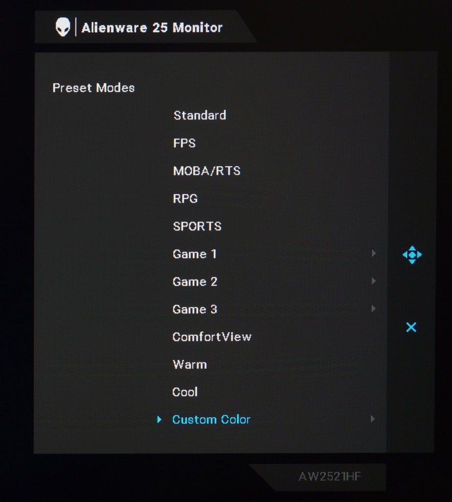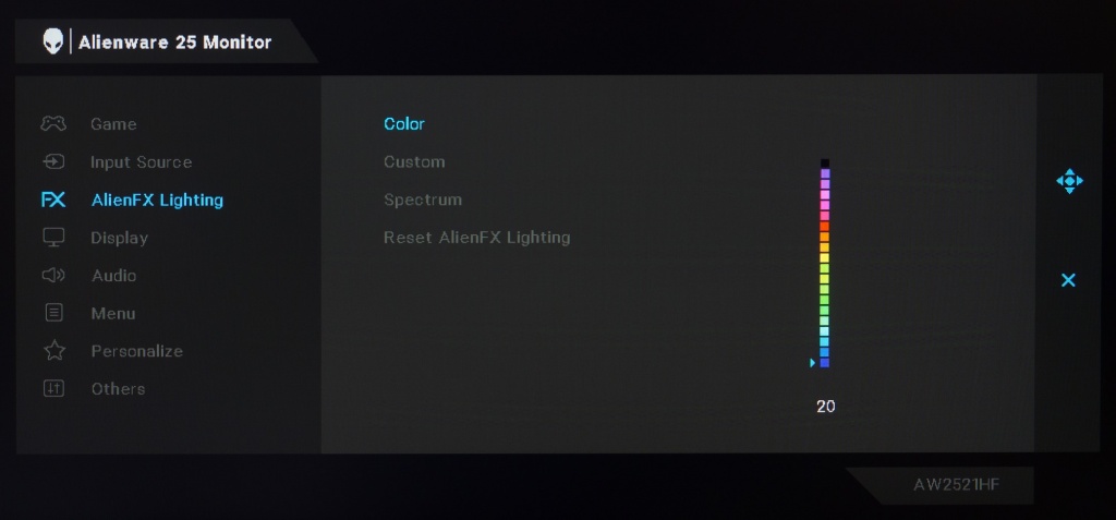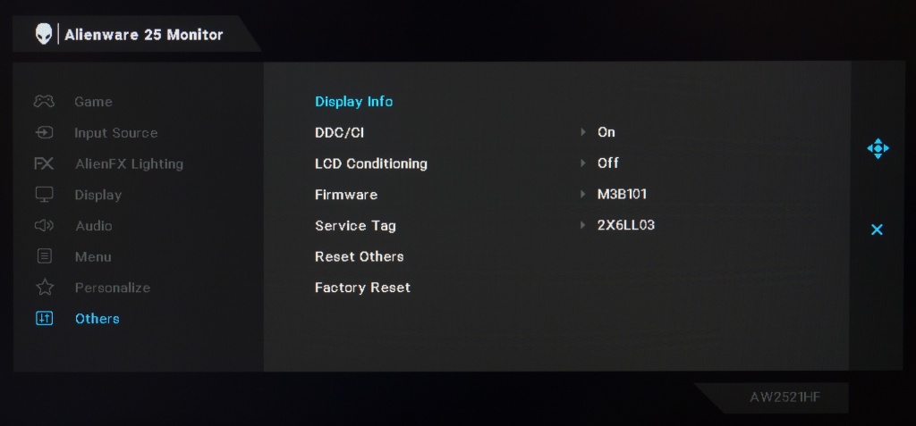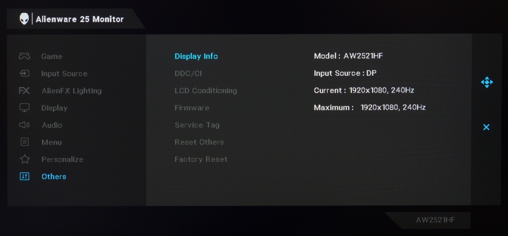 Монитор обошёлся без поддержки HDR даже в самом примитивном виде VESA Display HDR400, но прекрасно работает с такими системами адаптивной синхронизации (VRR), как AMD FreeSync Premium и G-Sync в режиме Compatible в диапазоне от 48 до 240 Гц и ниже при использовании технологии LFC от «красных». Вместе с тем заявленное время отклика у AW2521HF составляет от 1 до 4 мс, что по данным производителя зависит непосредственно от установленного уровня разгона Overdrive в меню.