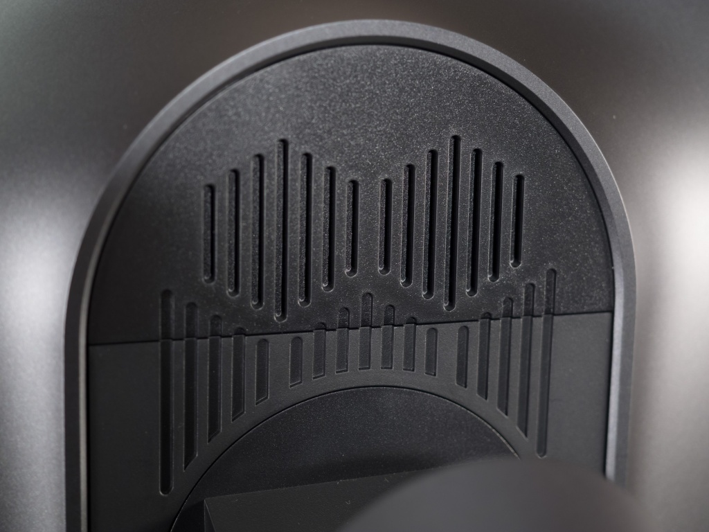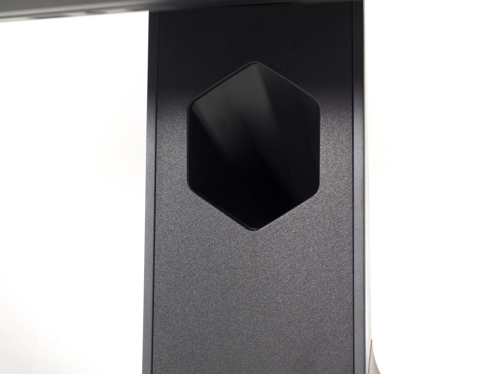Система прокладки кабелей выполнена за счёт выреза в центральной стойке. Решение простое и не очень эффективное. Дополняет его обновлённый пластиковый элемент декора, скрывающий колодку с интерфейсами и завершающий образ AW2521HF. Крышка оснащена двумя магнитами, которые автоматически поднимают её за несколько сантиметров до места установки и надежно удерживают в закрытом положении.