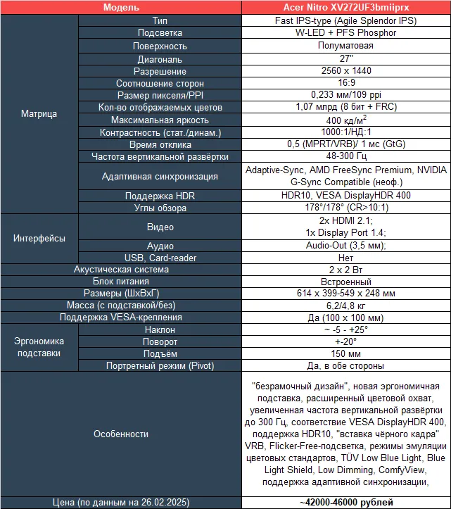 Рассматриваемый монитор был практически незаметно анонсирован во втором квартале 2024 года, а поступил в реальную продажу ближе к осени. Как и обычно – у Acer всё очень сложно с наименованием моделей, новинки не всегда продаются во всех регионах, на сайте компании частые ошибки (герой обзора хороший тому пример), а в реальной продаже Nitro XV272U F3 встречается чуть ли не только в РФ по цене от 42 до 46 тысяч рублей в среднем (актуально на конец февраля 2025 года).