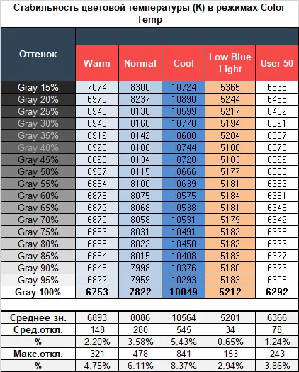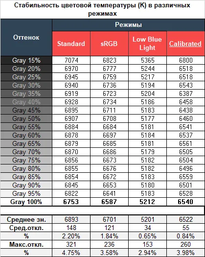 Тем временем, два основных режима демонстрируют среднюю стабильность ЦТ оттенков серого, а лучшие результаты были получены в режиме Low Blue Light и чуть хуже после настройки и калибровки.
