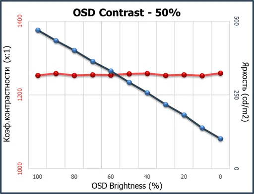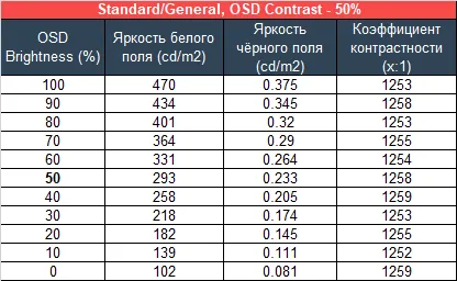 Для изучения стабильности контрастности и диапазона изменения яркости был выставлен режим Standard с полным цветовым охватом. Значение Brightness менялось с 100 до 0% с шагом в 10 единиц. Для представленной ниже таблицы измеренные значения были получены через программу HCFR, которая даёт возможность более точно оценить уровень чёрного (три знака после запятой) и соответственно определить достоверный коэффициент контрастности.