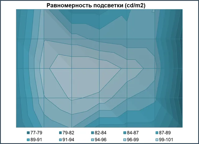 По представленной диаграмме поверхности можно наглядно увидеть, как сосредоточен уровень яркости по полю матрицы. Самая светлая зона достаточно маленькая, а яркость достаточно быстро снижается к краям панели, особенно это заметно в правой части панели.