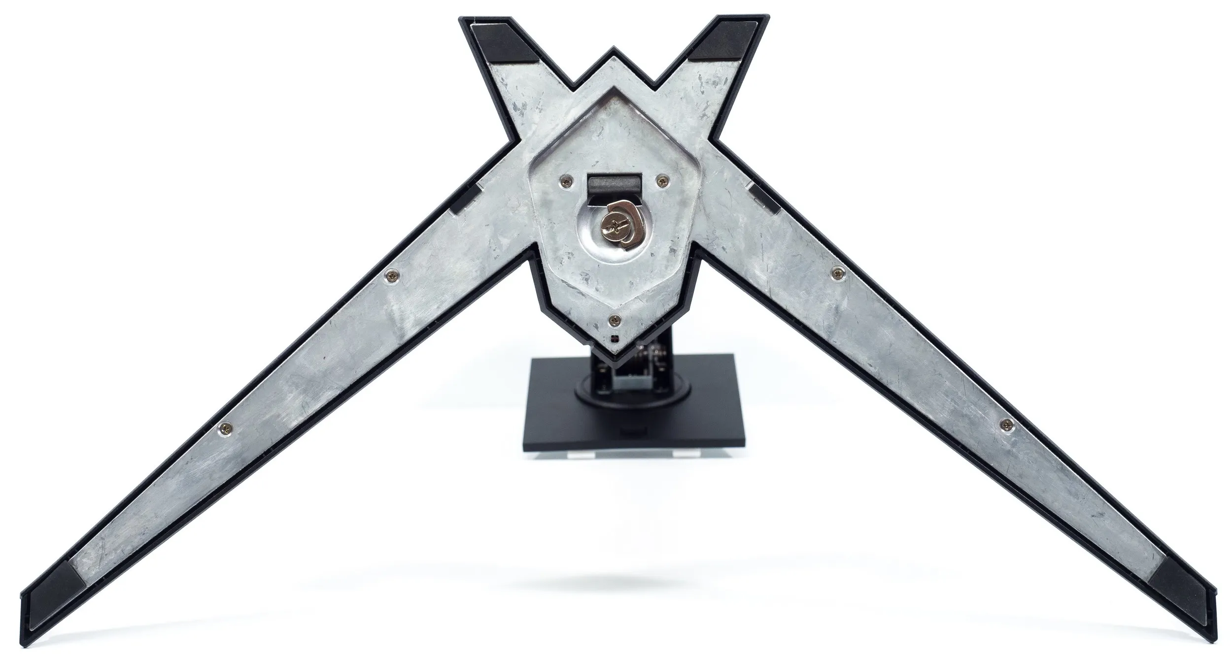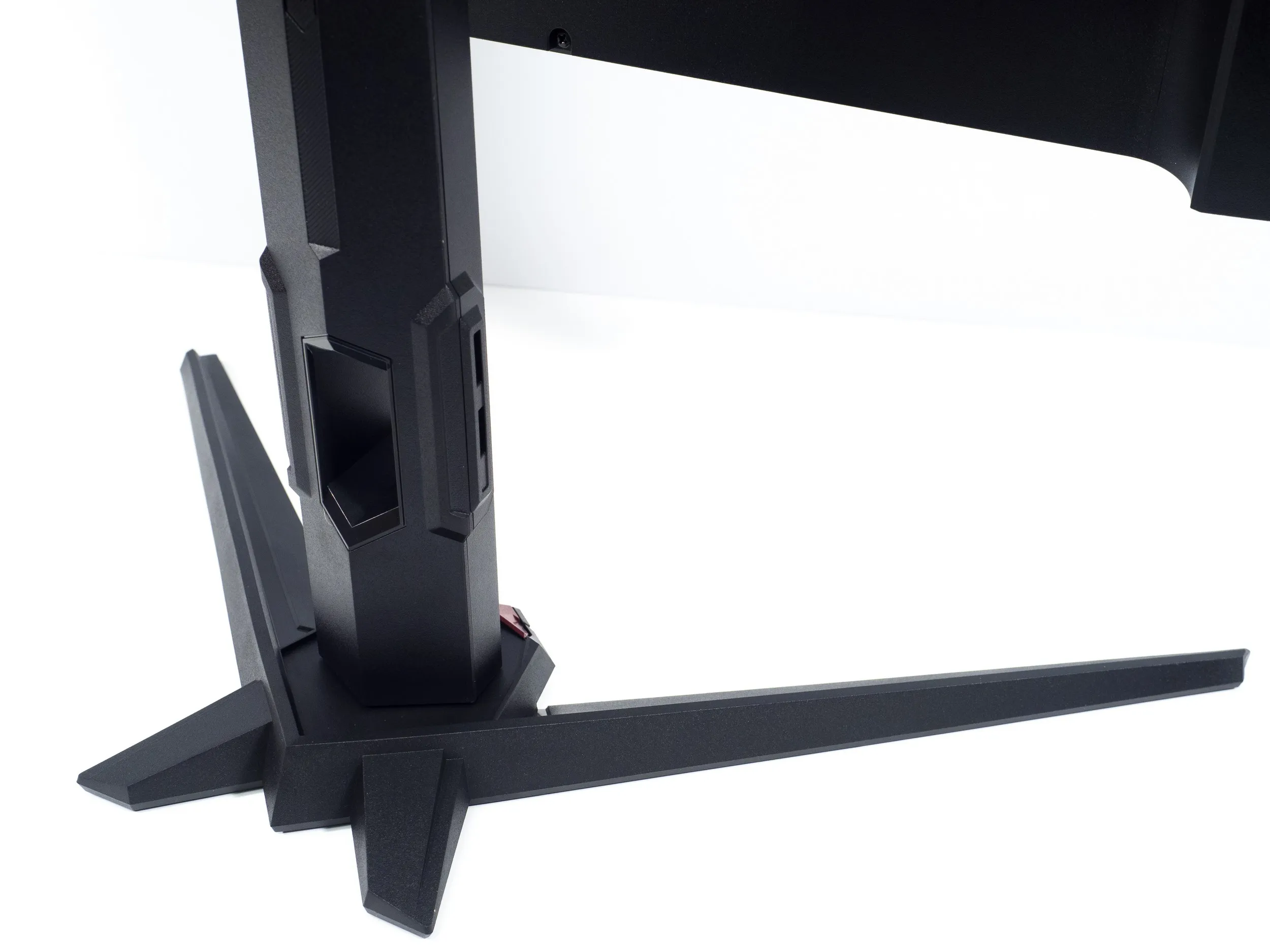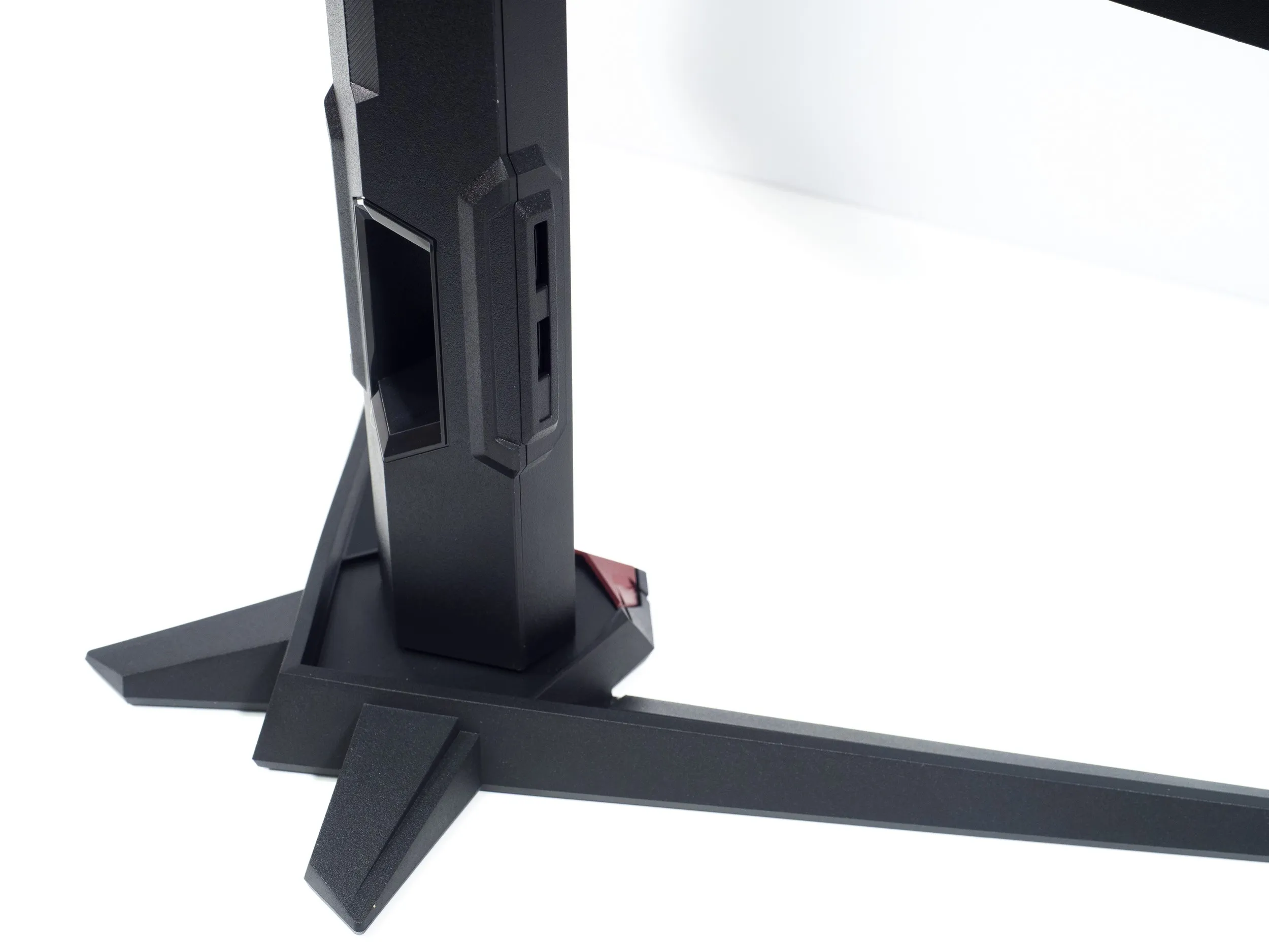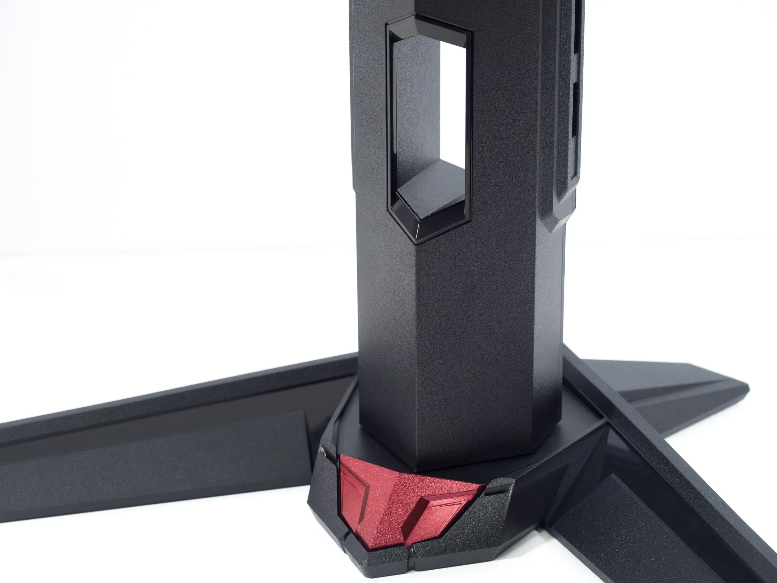 Подставка не занимает много пространства на рабочем столе и из-за относительно небольшой глубины двойной ножки сзади позволяет отставить монитор подальше. Она выполнена из пластиков с матовым и глянцевым покрытиями, чёрного, темно-серого и красного цветов. Несмотря на большое количество пластиковых деталей, основой подставки и центральной стойки являются металлические элементы, а поэтому проблем с надёжностью точно не возникнет.