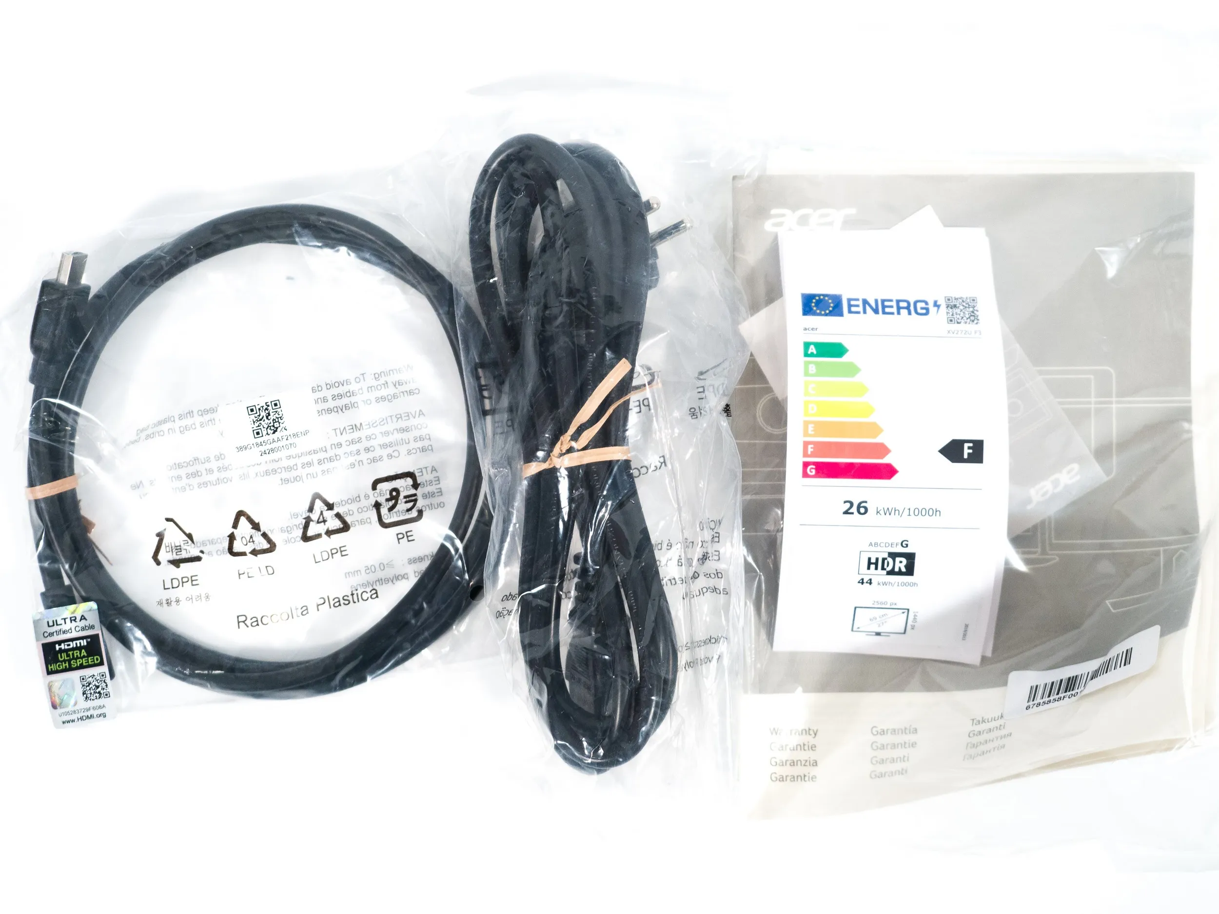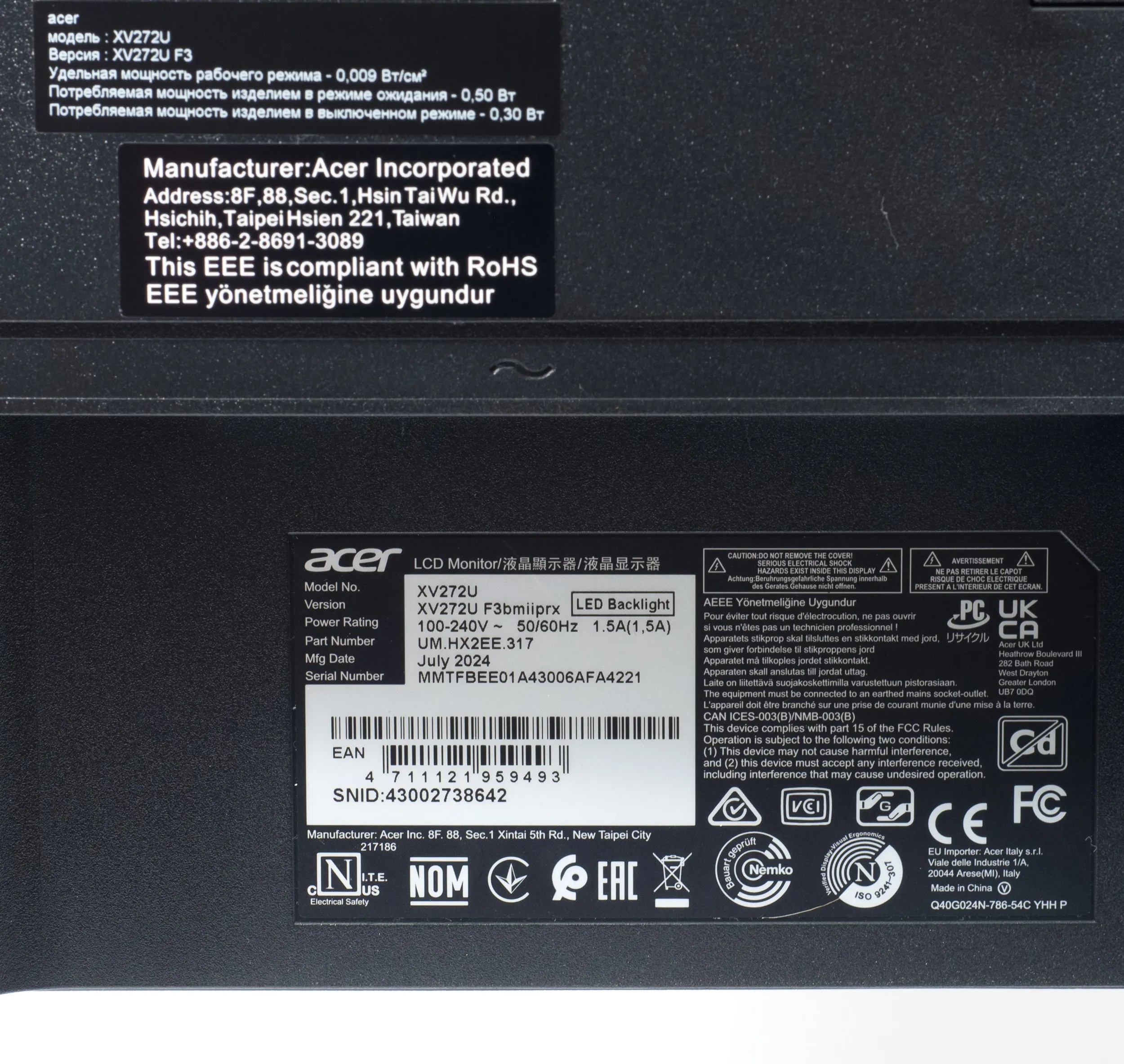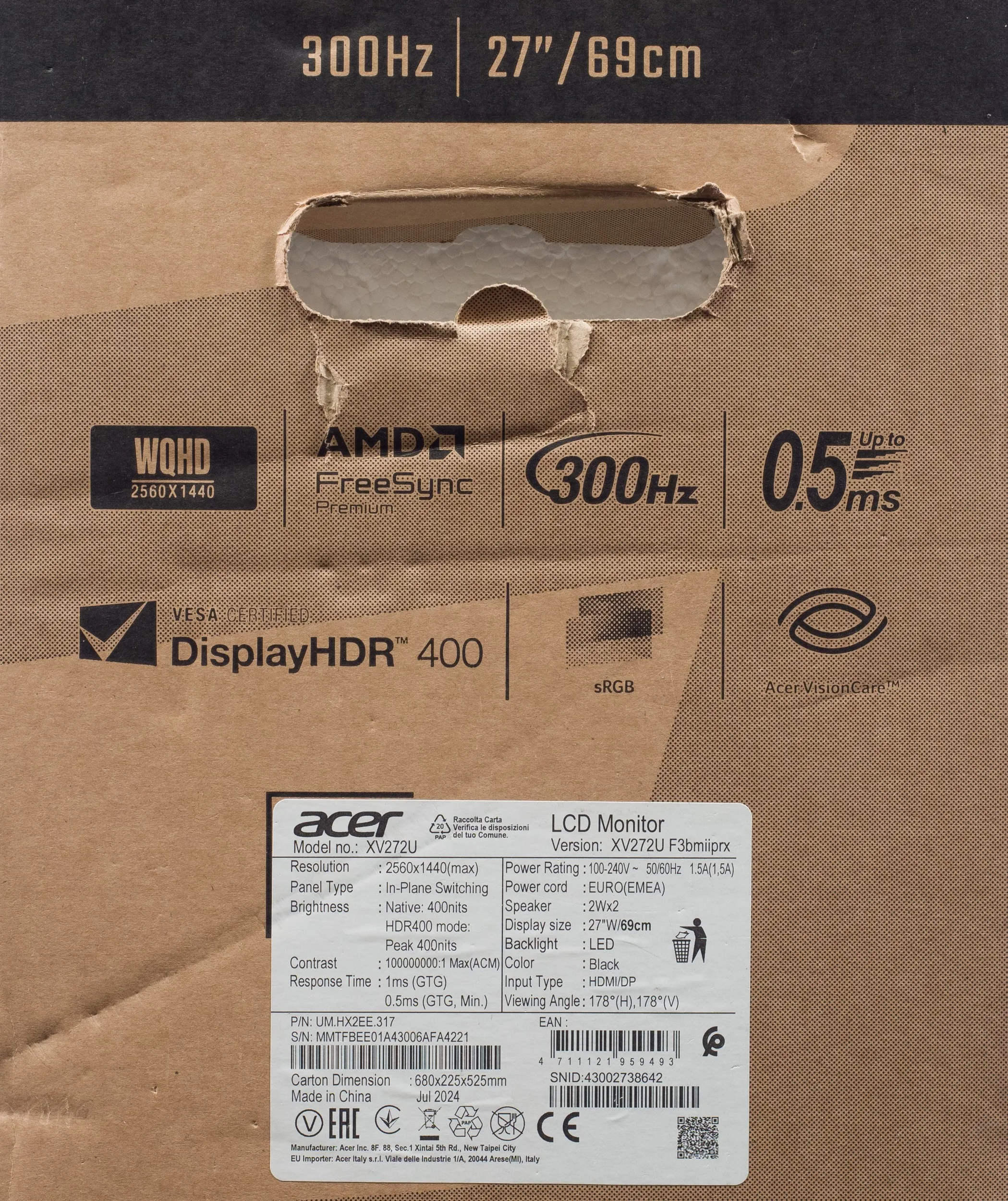 Наклейка на боковине коробки также сообщает ряд технических характеристик модели, номер партии и экземпляра, дату и место выпуска (июль 2024 года, Китай). Монитор, судя по всему, выполнен непосредственно силами самой компании Acer, что отличает Nitro XV272U F3 от моделей многих других брендов.