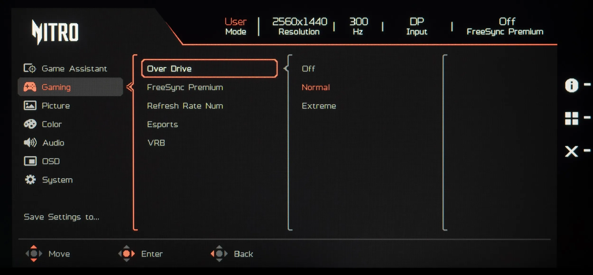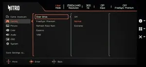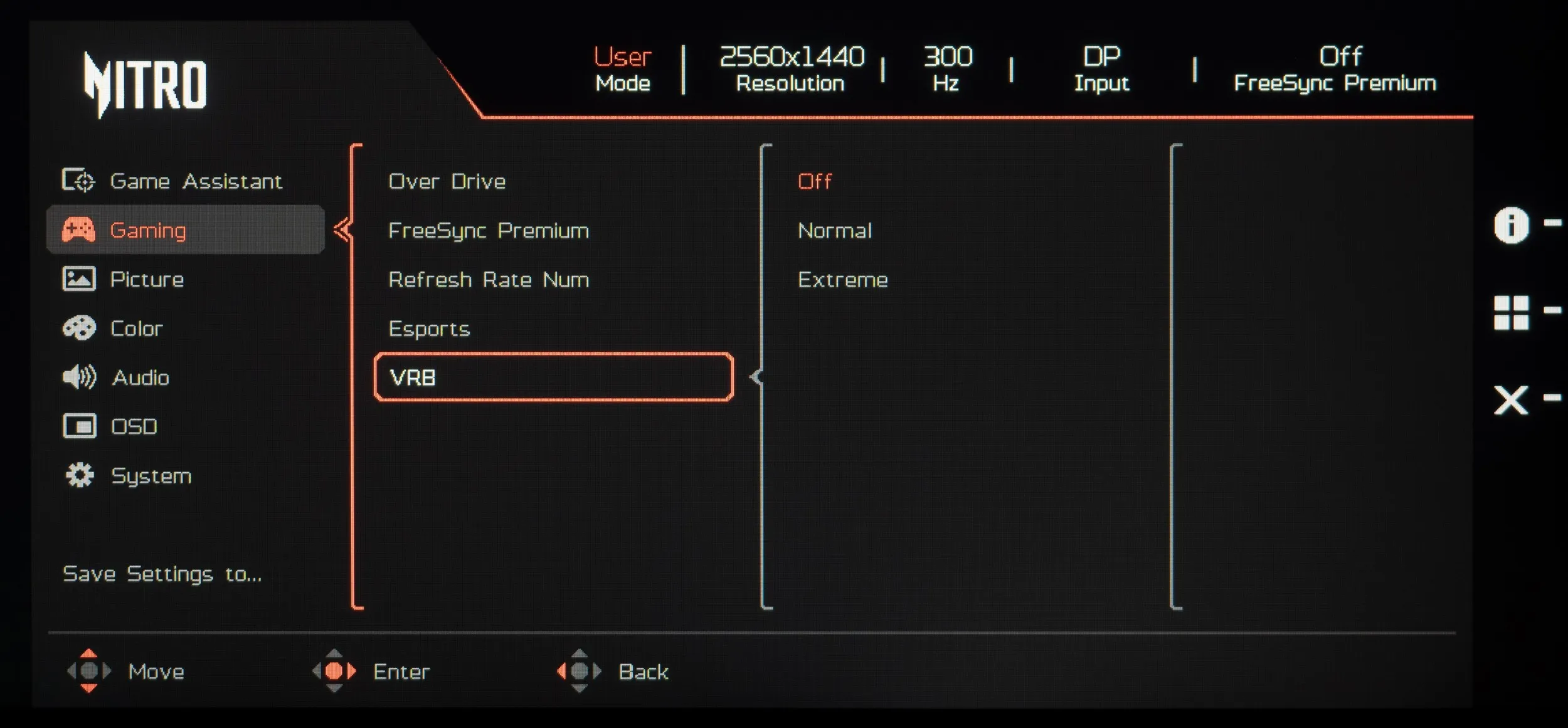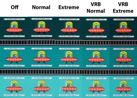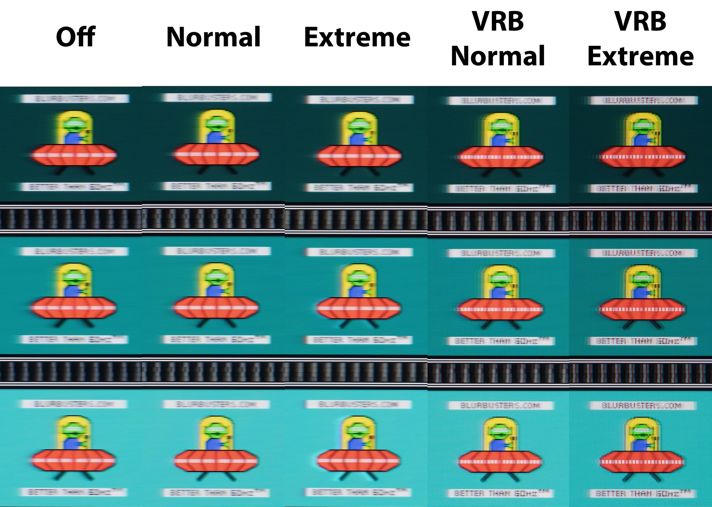 Монитору Acer не требуется дезактивация OD, как и переход к режиму Extreme, в котором проявляются видимые артефакты. Нет большого смысла, как оказалось, и в обоих режимах «вставки чёрного кадра» VRB – они работают неполноценно, подсветка в обоих случаях полностью не выключается, а поэтому «чёрный кадр» таковым не является. Визуально происходят довольно слабые изменения в визуальной чёткости движущихся элементов на экране, а переход от VRB Normal к VRB Extreme провоцирует снижение заблокированной яркости с 410 нит до 208 нит. Кроме того, повышается нагрузка на глаза – они становится выше, чем при работе монитора без активного VRB.
