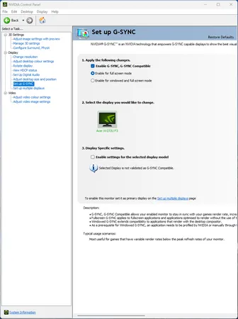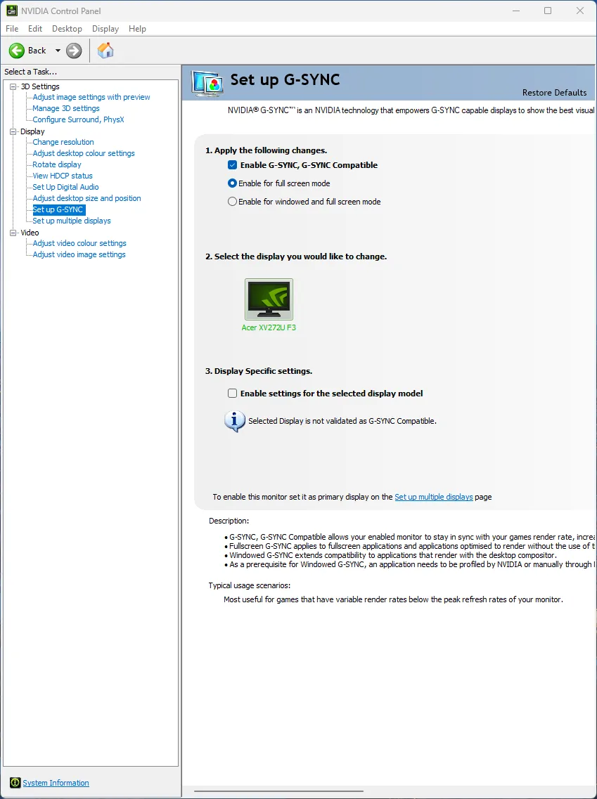 Отдельно отметим, что монитор Acer Nitro XV272U F3 официально сертифицирован как AMD FreeSync Premium, что говорит о полной поддержке открытого Adaptive-Sync и, безусловно, подразумевает беспроблемную работу с NVIDIA G-Sync в режиме Compatible (официальный сертификат, по данным на конец февраля 2025, отсутствует), что нами было подтверждено при фактическом тестировании новинки. Проблем не возникло, всё работает, но исключительно в диапазоне 48-300 Гц.