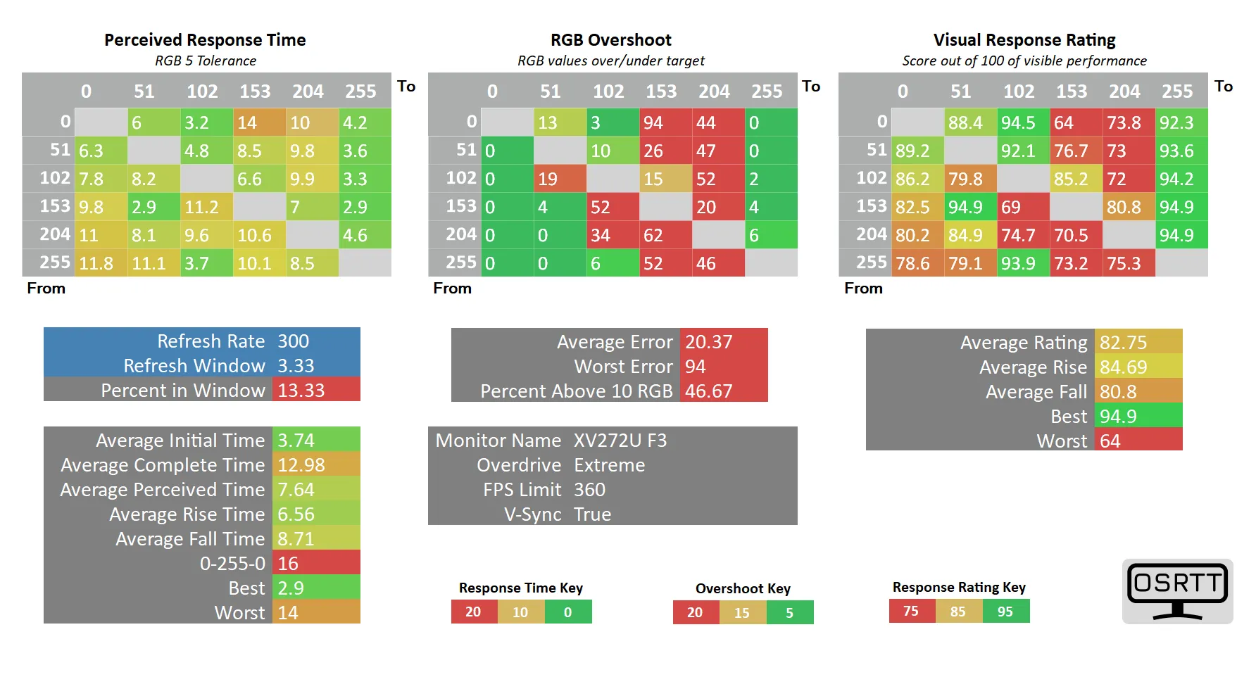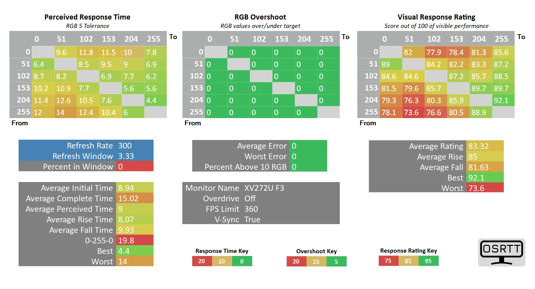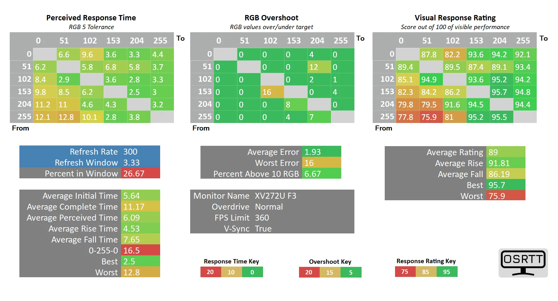 Несмотря на свою высокую частоту развёртки, XV272U F3 не сильно впечатлил своей реальной скоростью отклика, продемонстрировав средние (или даже ниже средних) результаты. Режимы VRB показали свою несостоятельность – полноценная вставка «чёрного кадра» не происходит ни в одном из двух режимов – подсветка полностью не выключается, эффект улучшения четкости очень слабый.