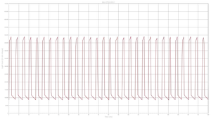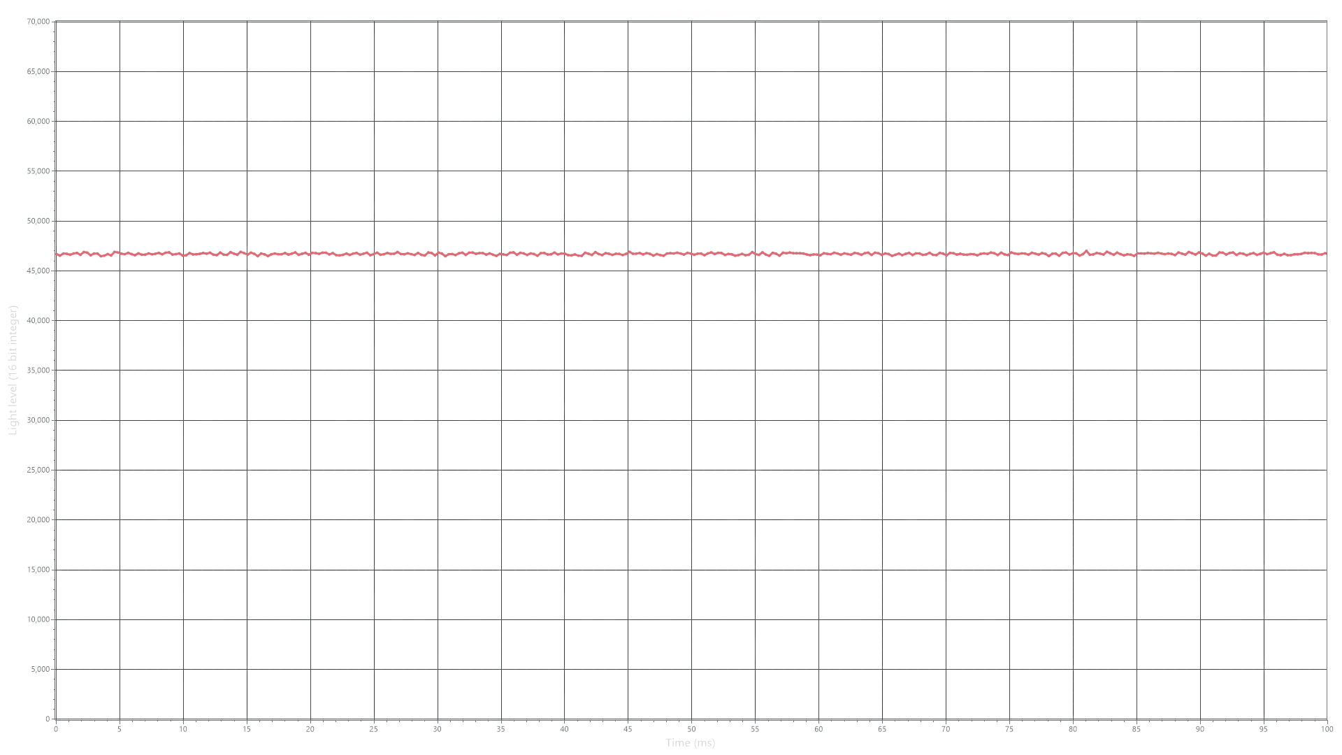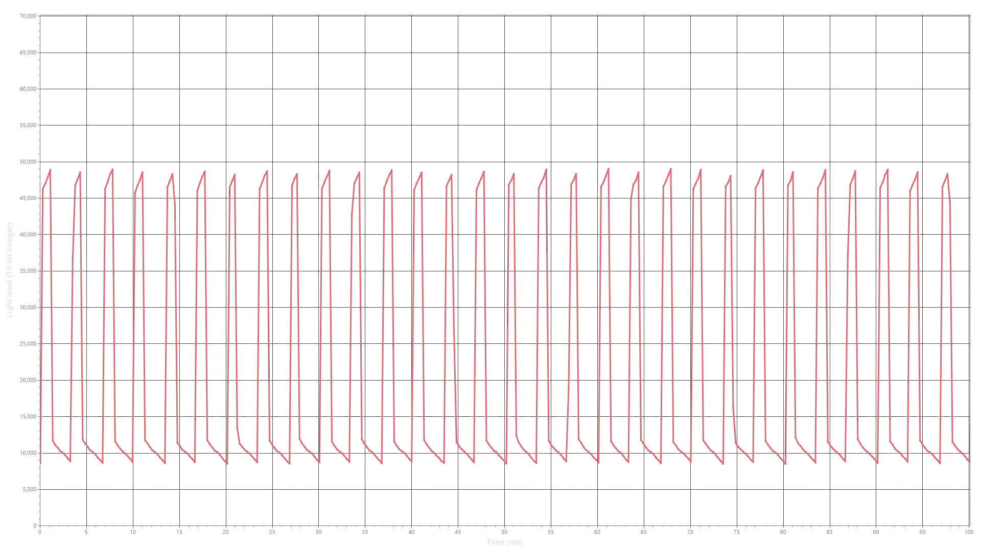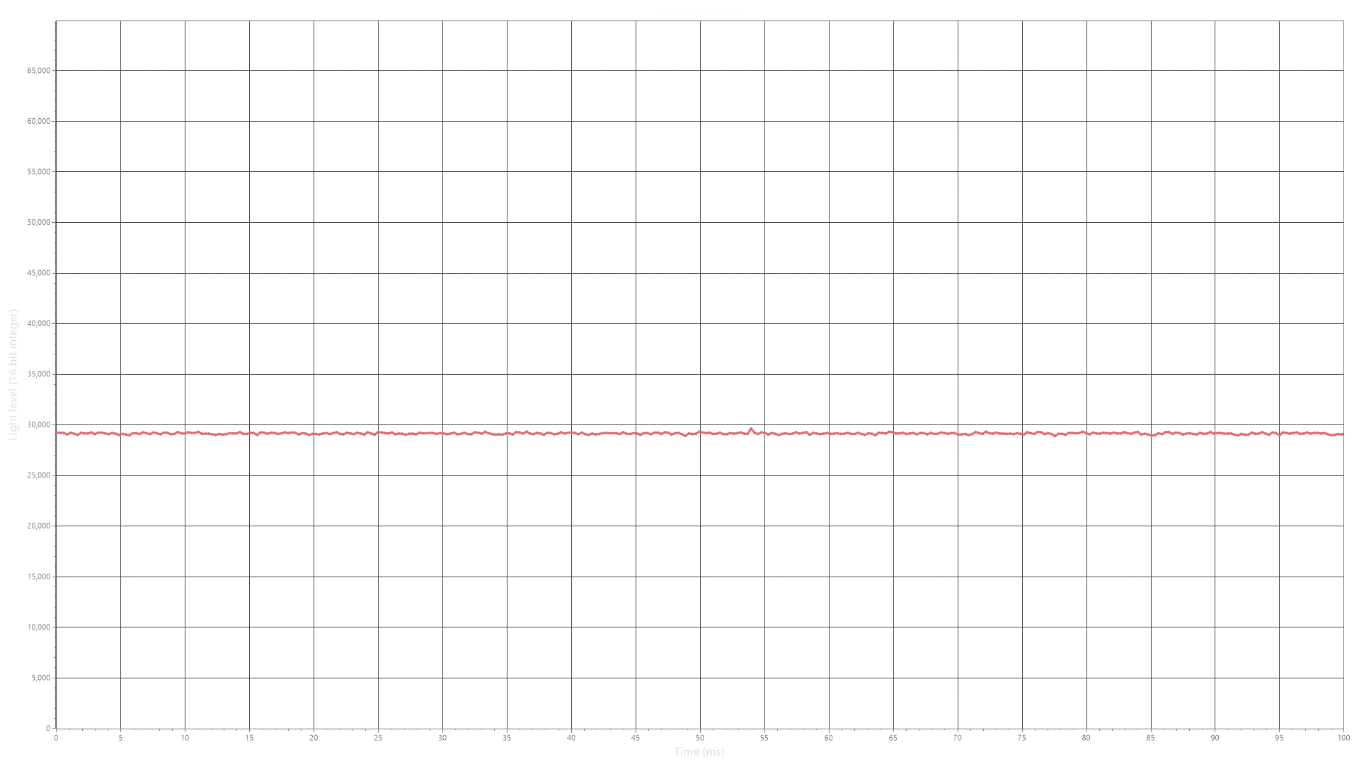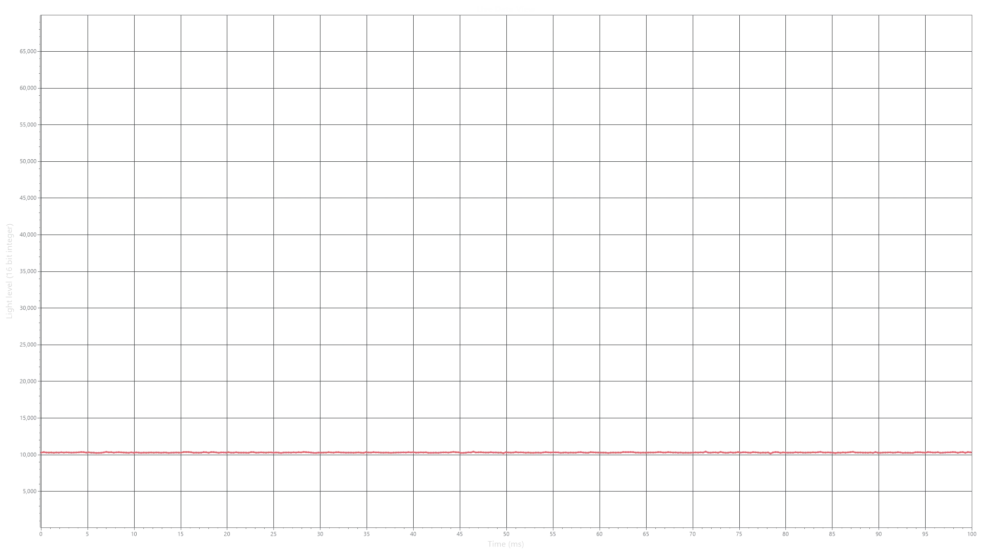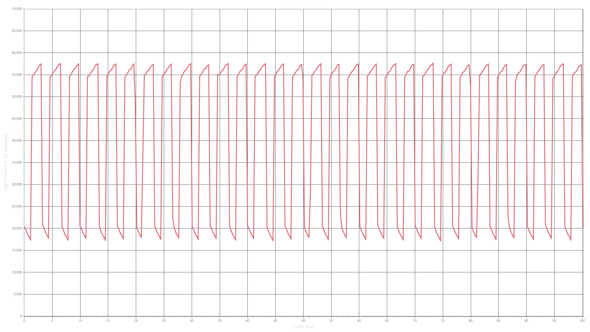 Если же активировать режим VRB, то подсветка будет мерцать на уровне частоты вертикальной развёртки монитора. Выше предоставлен пример замера на частоте 300 Гц при измерении белого поля. На участке в 100 мс отчётливо видно 30 выключений подсветки за данный период.