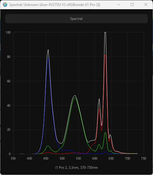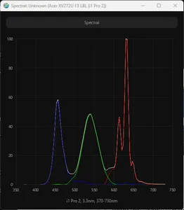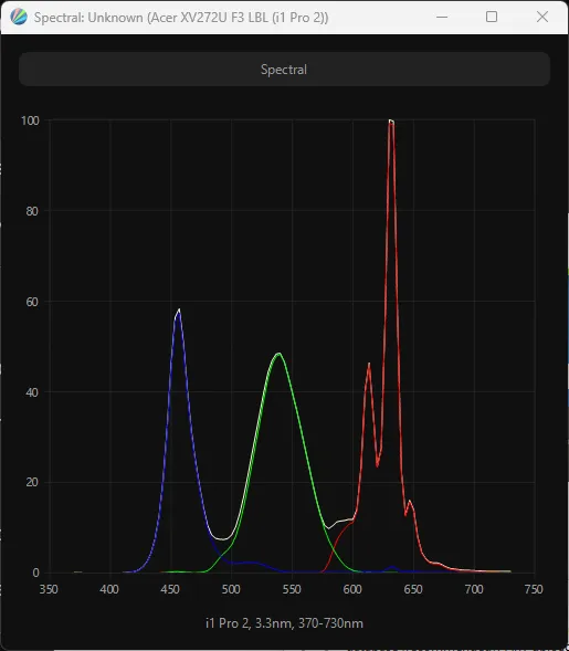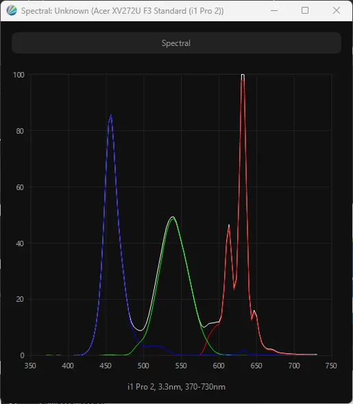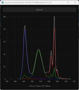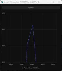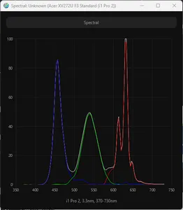 По представленным скриншотам видно, что две опорные точки из трёх заметно сдвинуты в пространстве относительно стандартного цветового стандарта sRGB, превосходя его на многих участках. При этом новинка Nitro XV272U F3 практически полностью покрывает наиболее актуальный в 2025 году стандарт DCI-P3 (он же Display P3) и делает это лучше, чем многие модели на рынке, в том числе гораздо более дорогие.