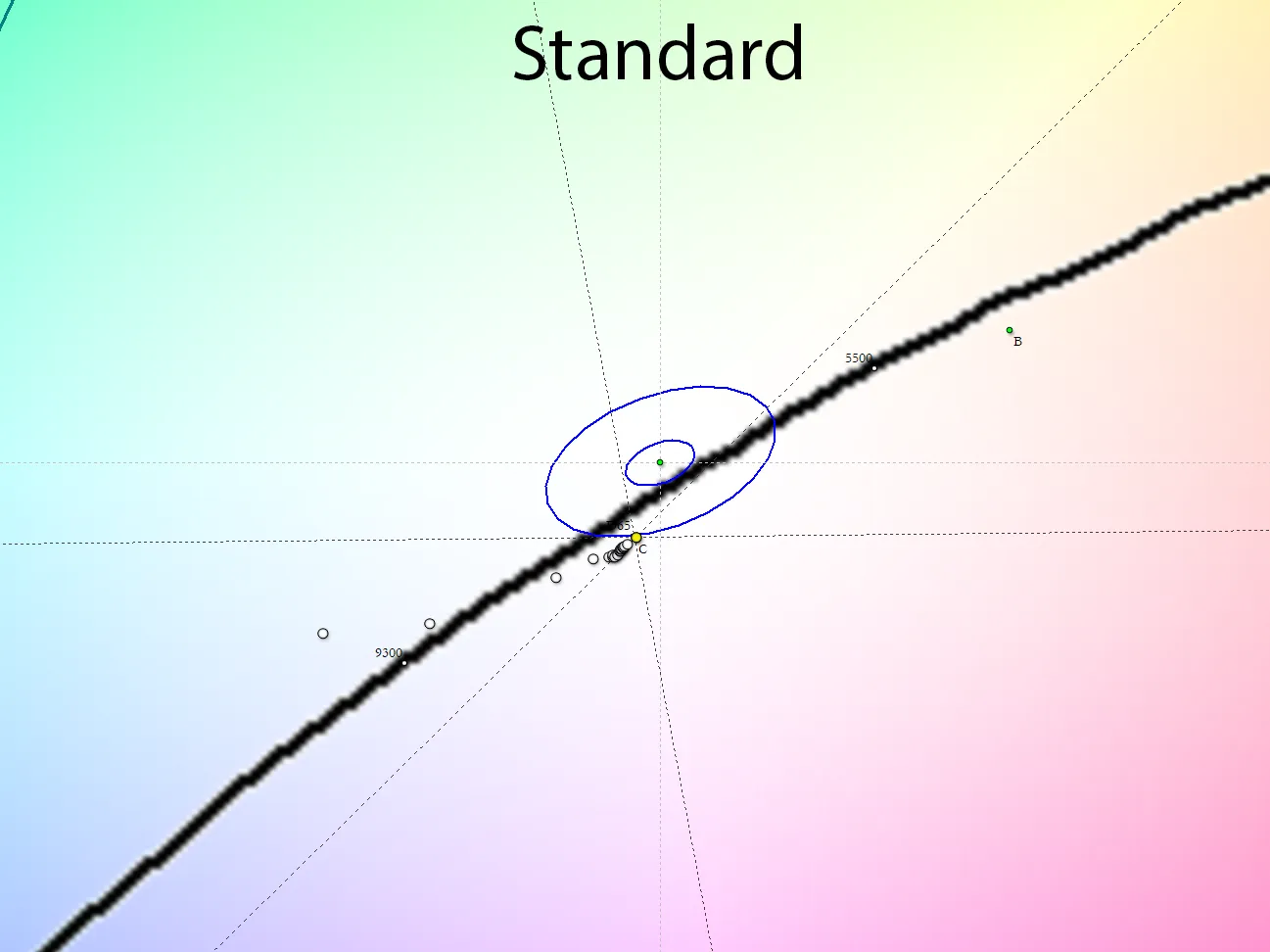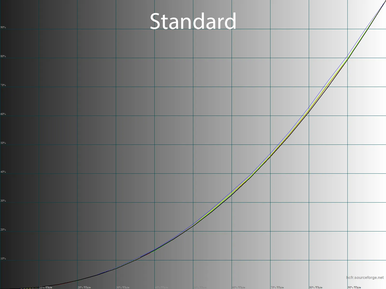 Режим Standard демонстрирует качественно выставленные гамма-кривые: контраст верный, различимость в тенях достаточная, завалов в светах нет, дисбаланс RGB на всём диапазоне минимальный. Основная масса точек серого клина расположились за пределами DeltaE<10. Паразитный оттенок есть, но визуально ощущается слабо.