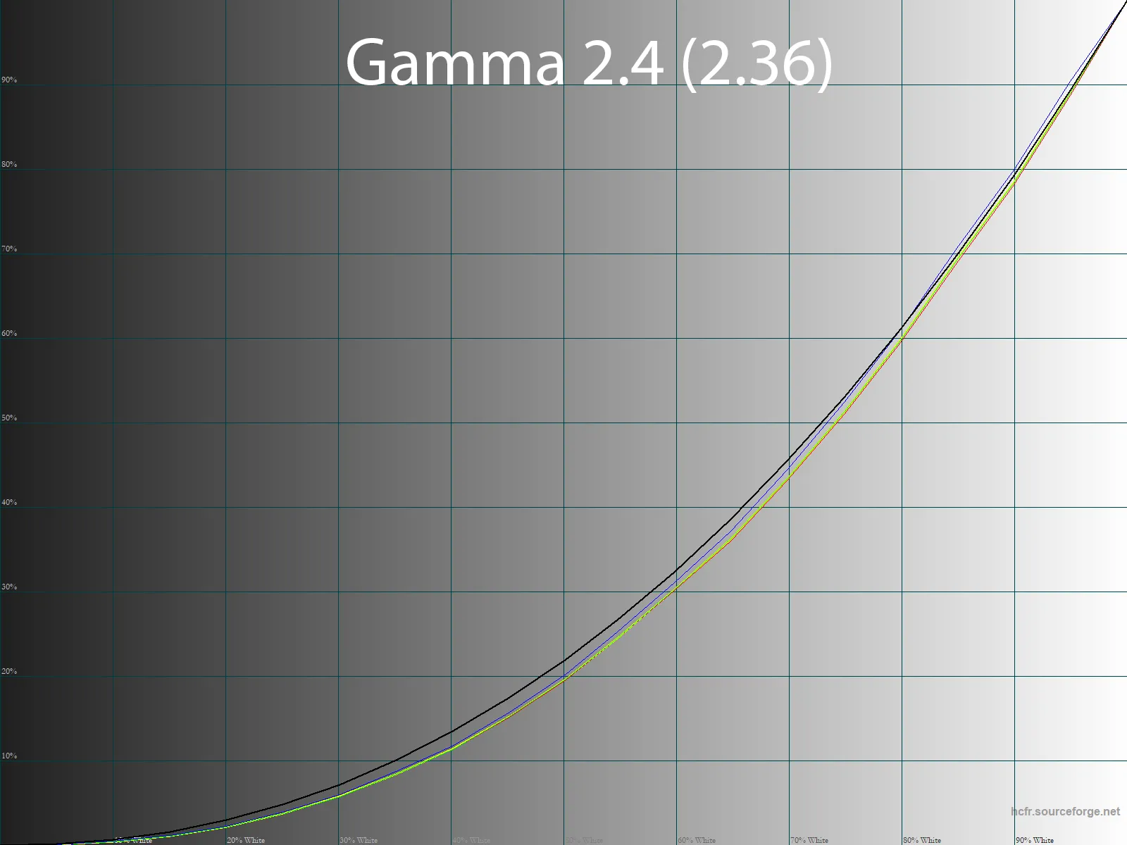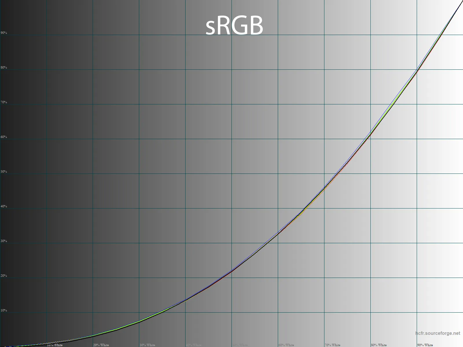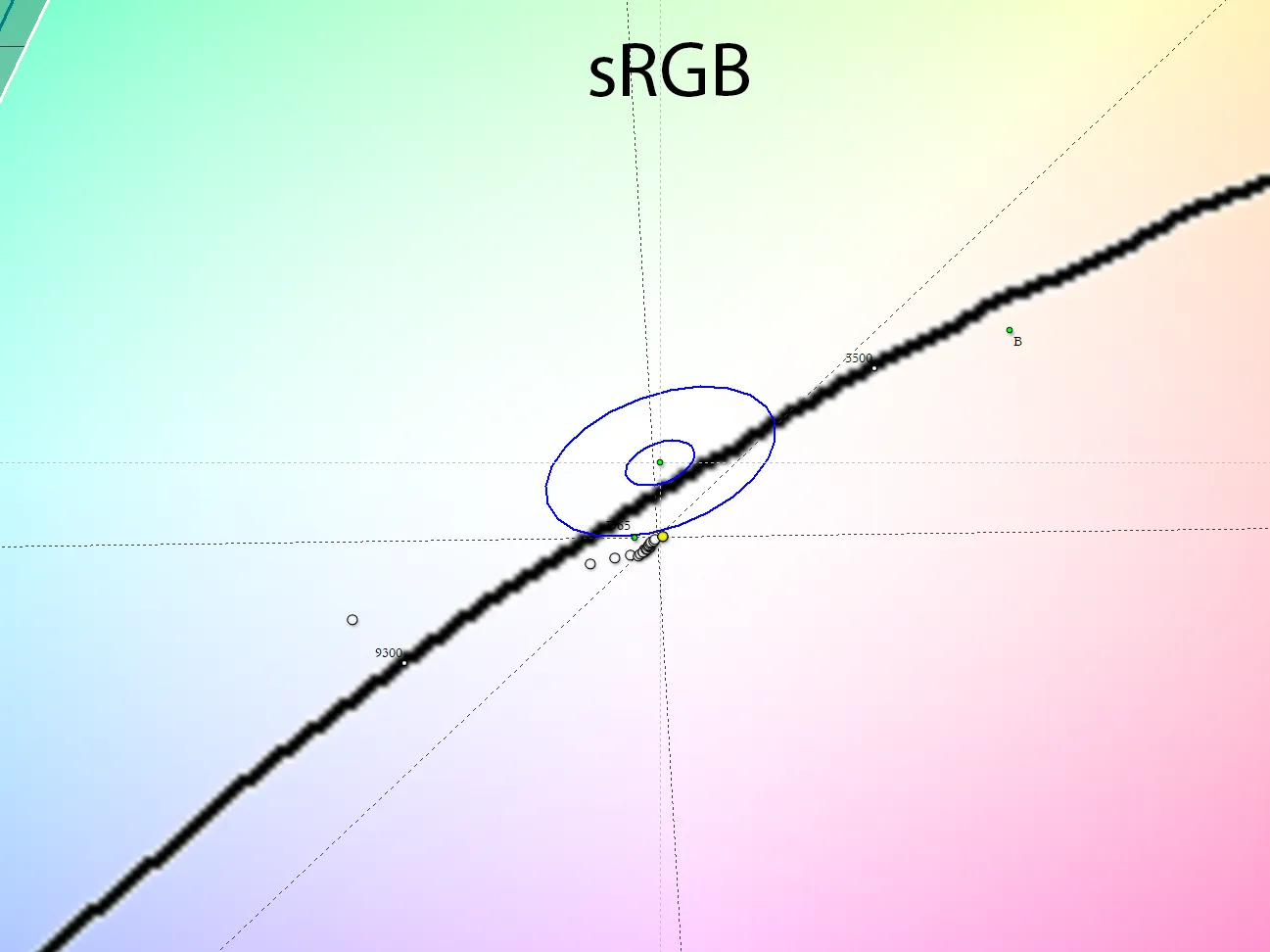 Режим sRGB радует точностью установки гамма-кривых ещё больше. Среднее значение снижено до 2.14, тени различимы ещё лучше, насыщенность снижена до адекватной, но на оттенках серого проблем больше, чем при заводских настройках и ничего с этим, кроме полноценной калибровки режима, не сделать. Жаль.