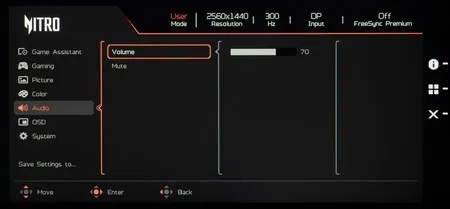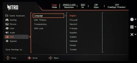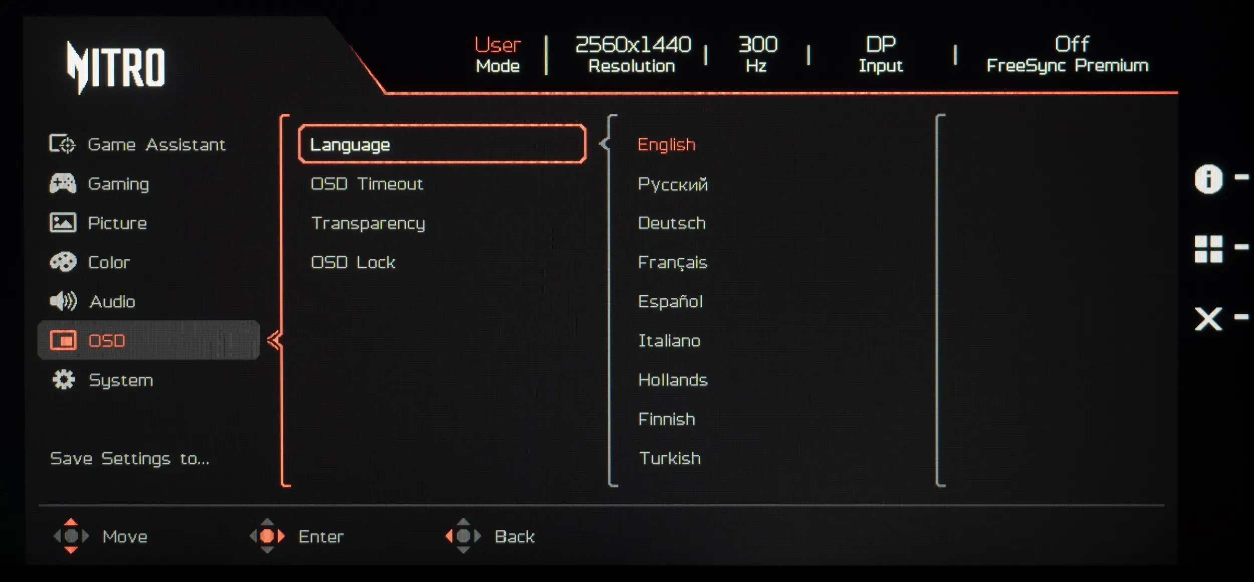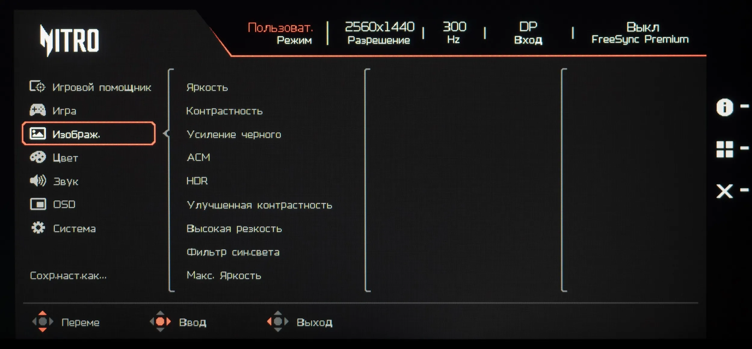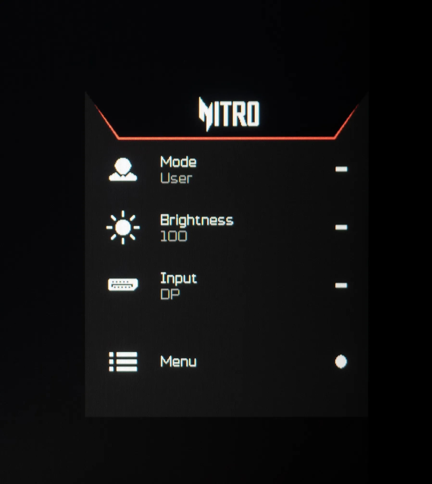 Внешний вид меню и его наполнение у Nitro XV272U F3 соответствуют тому, что можно встретить в большинстве новинок бренда: всё лаконично и строго, даже несмотря на наличие уже ставших классикой жанра красных элементов. Дизайнерами была слегка усилена глубина цвета подложки меню, добавлено больше графических элементов. Логика управления проста и понятна, а благодаря 5-позиционному джойстику навигация по меню максимально упрощена.