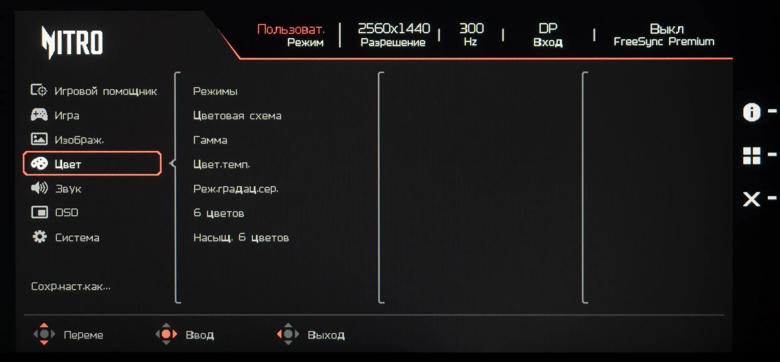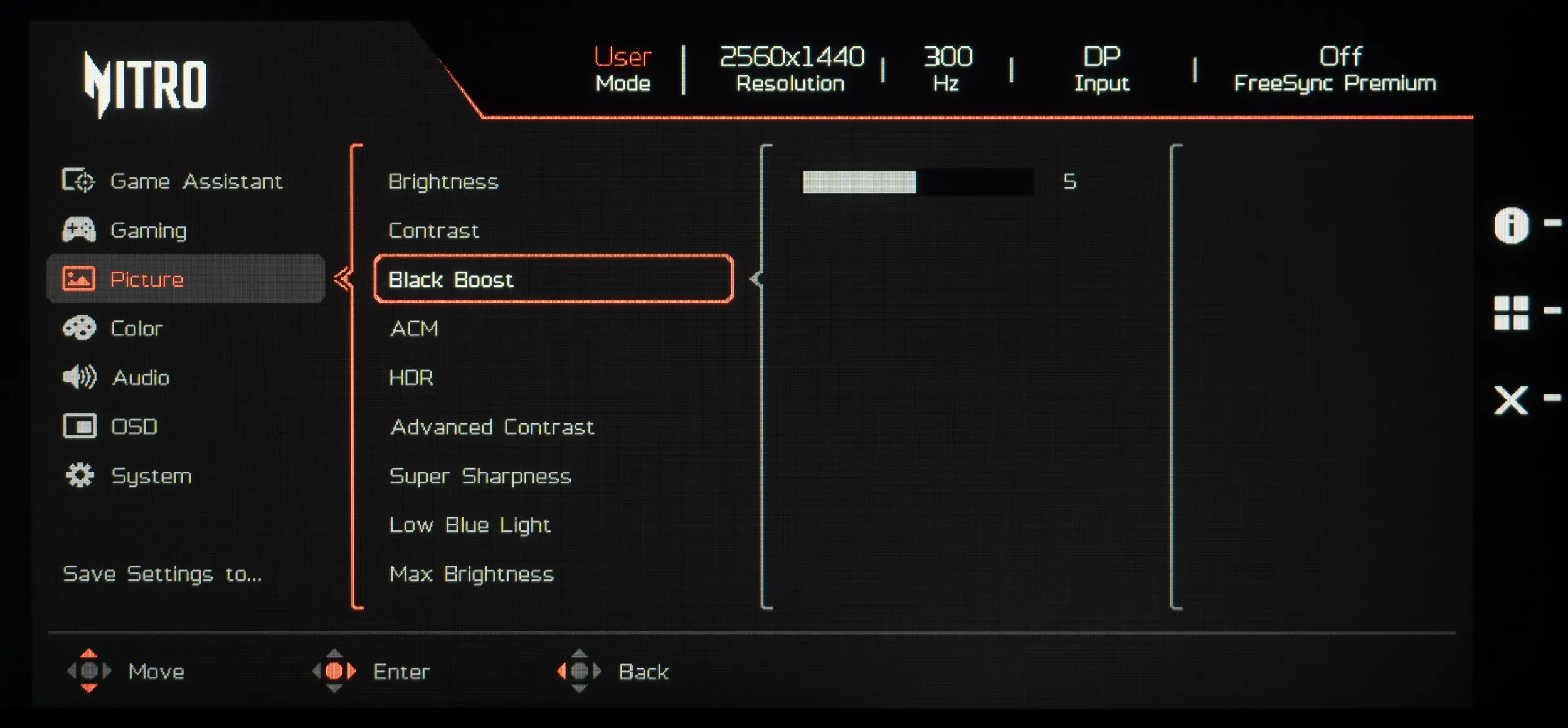 У новинки Acer отсутствует датчик внешней освещённости для автоматической регулировки яркости, а в меню есть несколько дополнительных параметров, напрямую влияющих на точность цветопередачи и качество картинки в целом. В случае с Nitro XV272U F3 мы решили посмотреть на влияние функций Black Boost и Gamma.