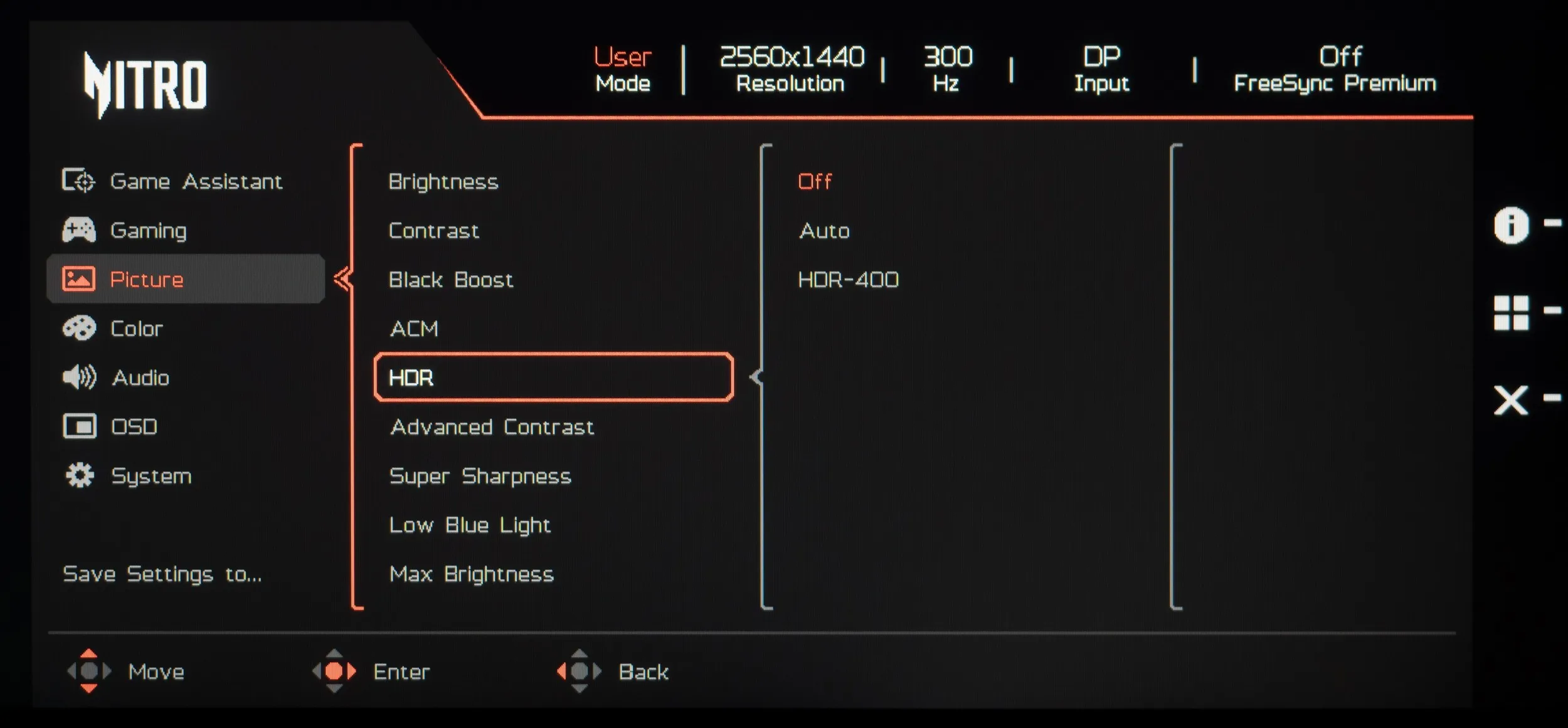 Здесь же можно активировать режим HDR (Auto или HDR-400) и технологию Super Sharpness (но лучше этого не делать, а в режимах sRGB и даже HDR, где она включена, её стоит выключить). Для вывода монитора на доступный максимум требуется активация Max Brightness, а вот новый пункт Advanced Contrast лучше не трогать – более корректно менять контрастность позволяют предустановленные режимы Gamma.