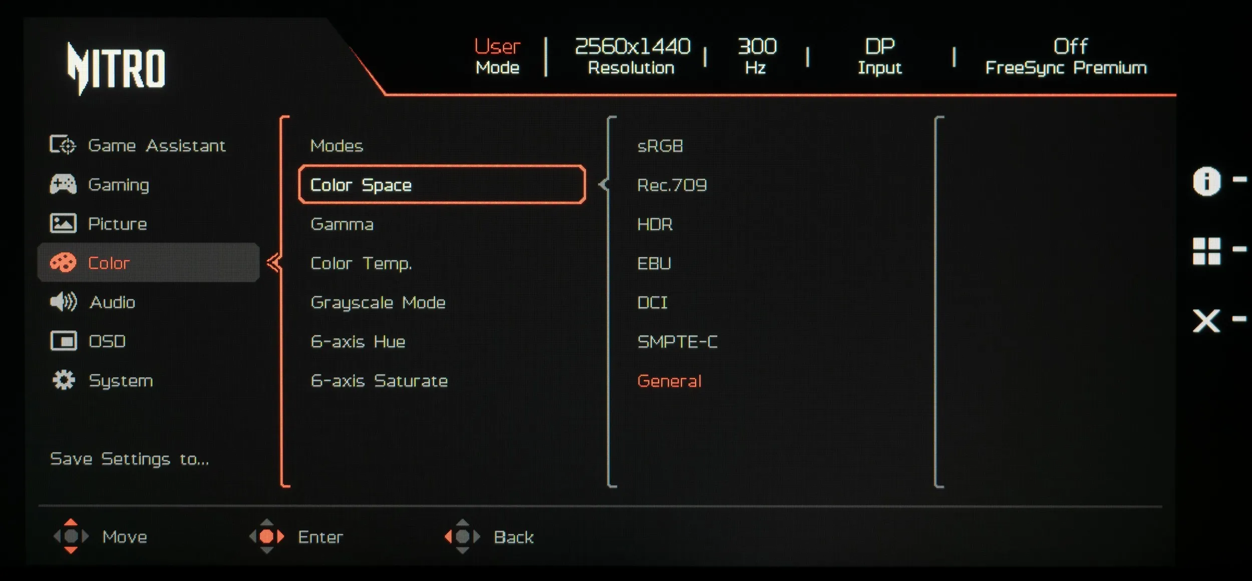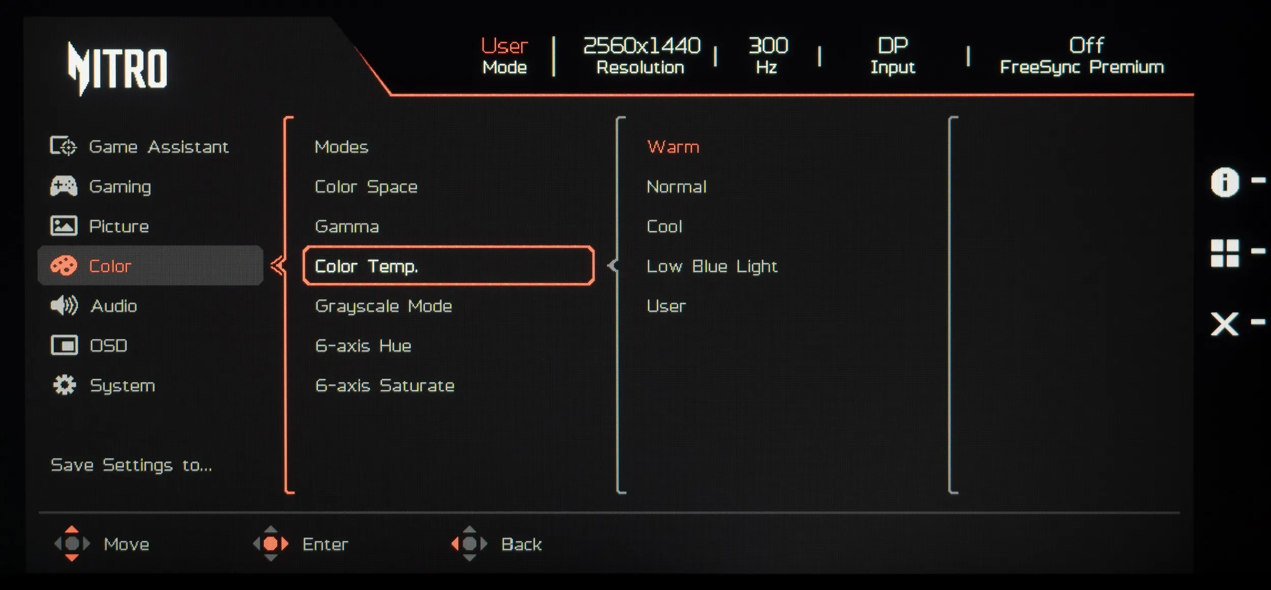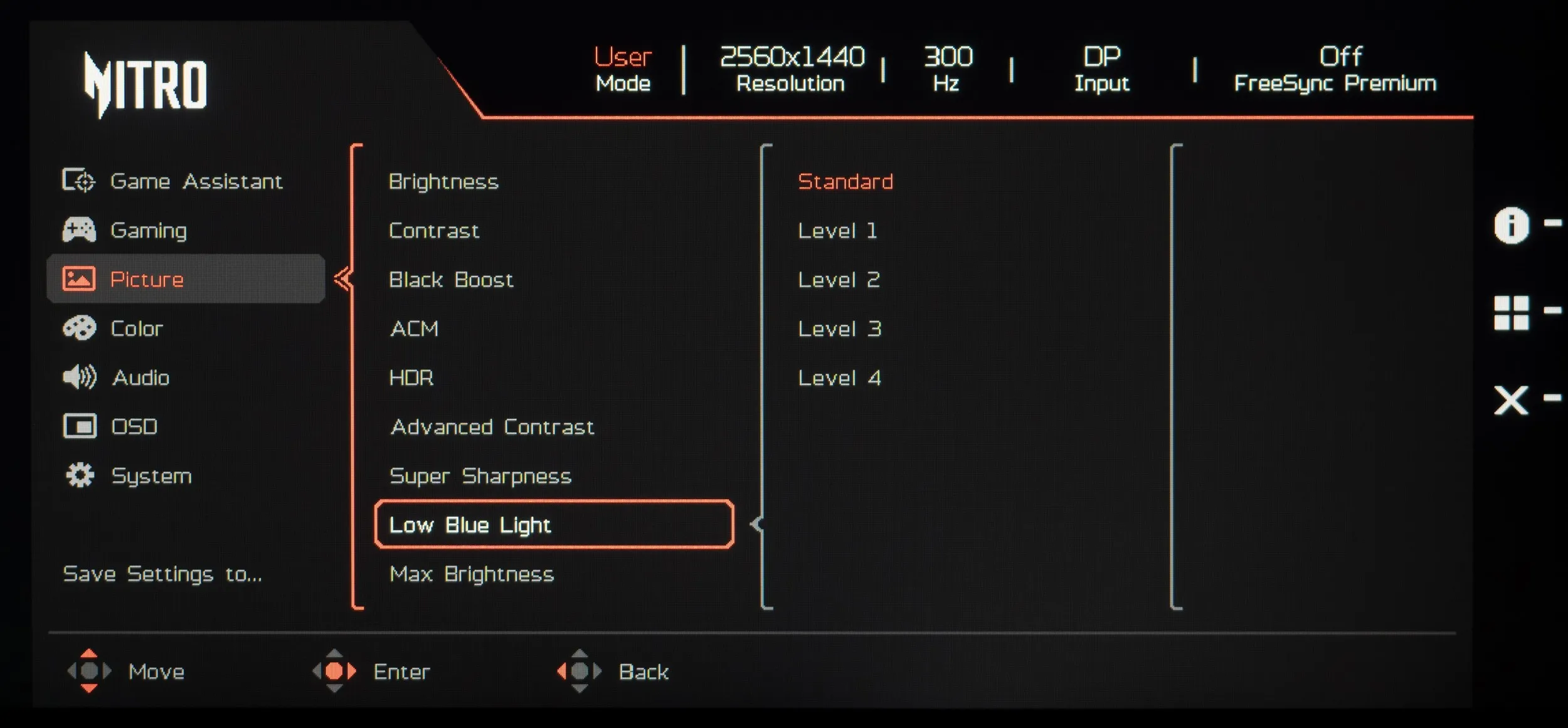 По умолчанию монитор Acer работает в режиме с максимально доступным цветовым охватом, но в настройках есть несколько режимов эмуляции основных цветовых пространств с более узким спектром (в основном это sRGB/Rec.709). Также можно воспользоваться основным режимом Low Blue Light либо его подрежимами с резко сниженной синей компонентной (пример представлен выше) – это уменьшает цветовую температуру, а вместе с ней и снижает нагрузку на глаза.