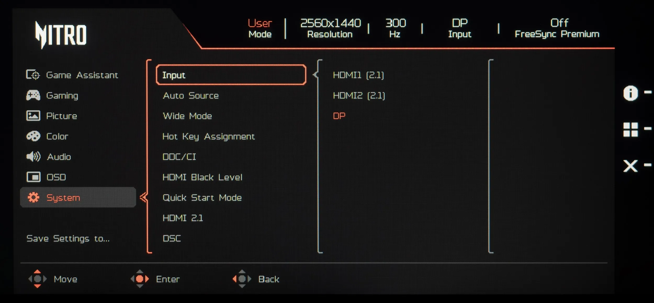 Чтобы изменить динамический диапазон при подключении по HDMI и выбрать рабочий режим, указать источник сигнала, необходимо зайти в последний раздел. Здесь же можно получить доступ к изменению функций для клавиш с быстрым доступом, включить поддержку DSC, а также перенастроить режим работы встроенного скалера изображения. Доступна активация быстрого включения монитора – без вывода приветственного экрана.