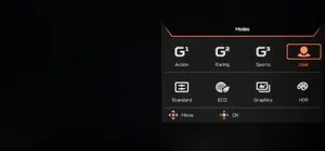 Если нажать на джойстик или перевести его в любую позицию, на экране появляется прямоугольный блок со следующими возможностями: активация предустановленных режимов, регулировка яркости, выбор источника сигнала и переход к основному меню.