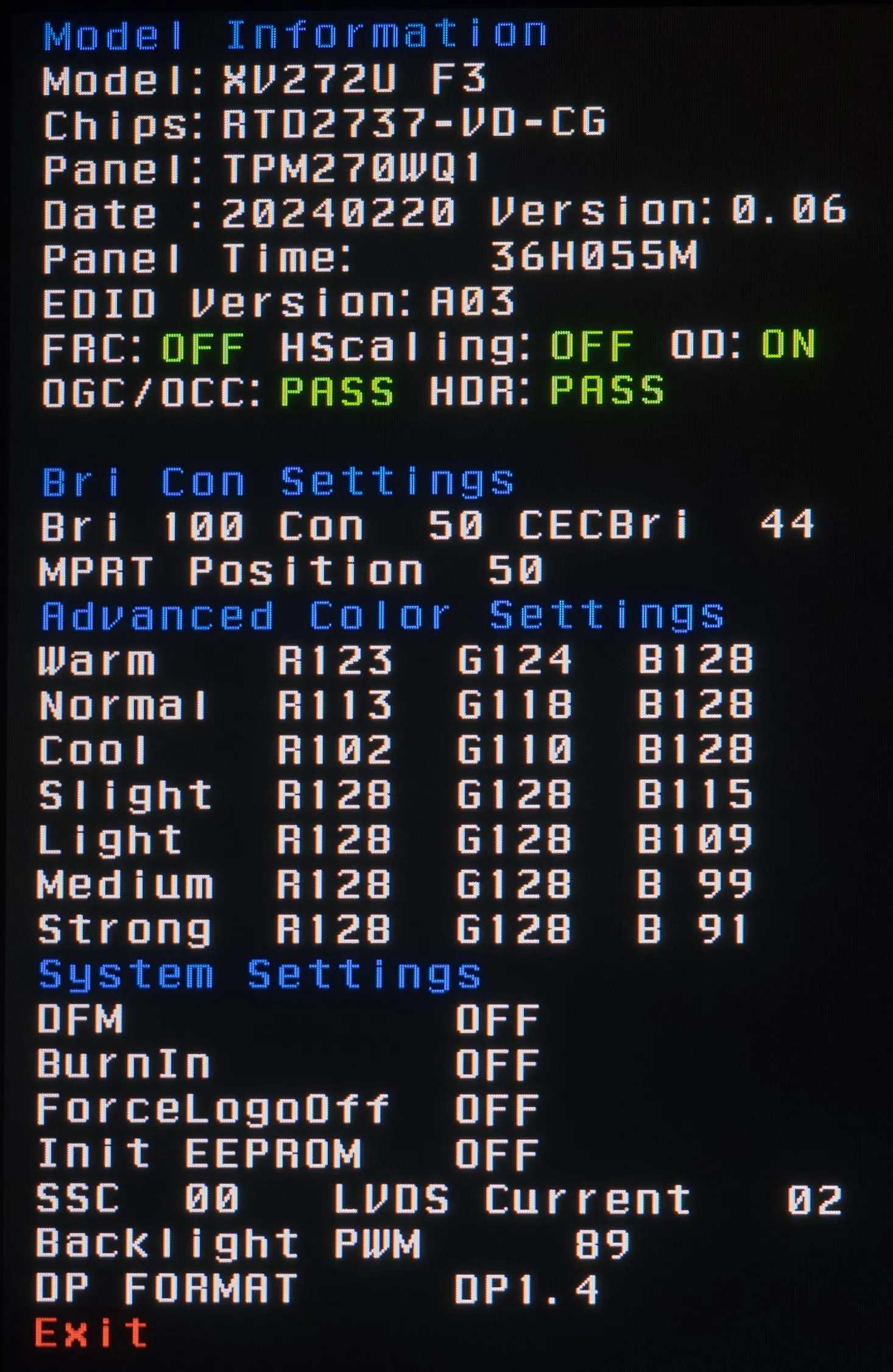 Доступ к сервисному меню монитора был найден с помощью классического сочетания – зажатия второй и четвёртой клавиш сверху и последующее включение монитора. Меню очень объемное, с огромным количеством выставленных параметров. В нём можно узнать версии матриц, встроенного скалера, прошивки, дату производства, версию блока EDID, время наработки. Указаны значения (включено или выключено) для FRC, OD и HDR. Также присутствуют значения RGB для режимов Color Temp. и подрежимов Low Blue Light. Можно контролировать и другие важные параметры, но без понимания что и к чему – ничего лучше не менять. Лучше не сделаете, а вот хуже – легко. Да и гарантию можно потерять. Мы предупреждаем!