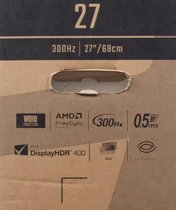 На «фасадах» представлены подробные данные по монитору: тип матрицы, разрешение, время отклика «до 0,5 мс», частота развёртки 300 Гц, поддержка AMD FreeSync Premium и VESA DisplayHDR 400, соответствие стандарту sRGB.