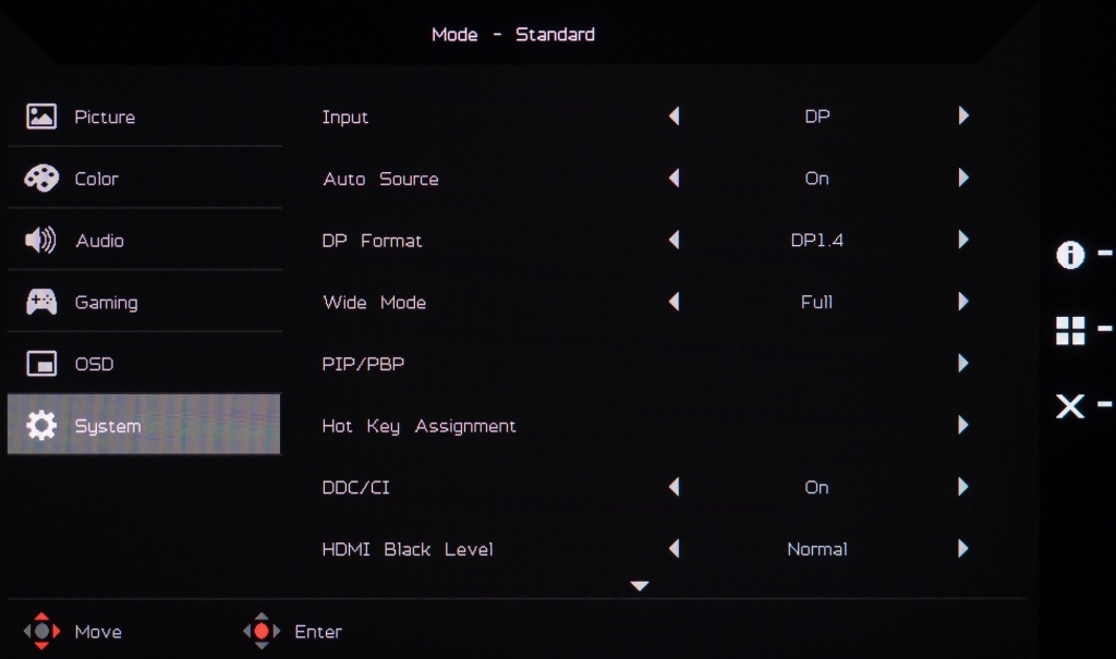 Изменить режим работы встроенного скалера, выбрать версию DP, установить рабочий диапазон HDMI (уровень чёрного), переназначить две функции с быстрым доступом, выбрать интерфейс подключения – всё это можно в разделе «System». Здесь же представлен дополнительный подраздел с настройками функций PiP|PbP, возможность активации быстрого режима включения (без логотипа/заставки производителя) и изменение режима работы встроенного скалера. Функция сохранения настроек в один из трёх игровых режимов eColor в XV272UPbmiiprzx была удалена.