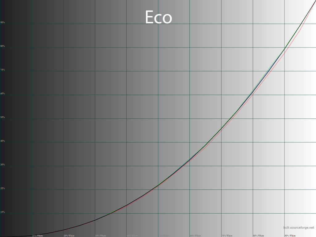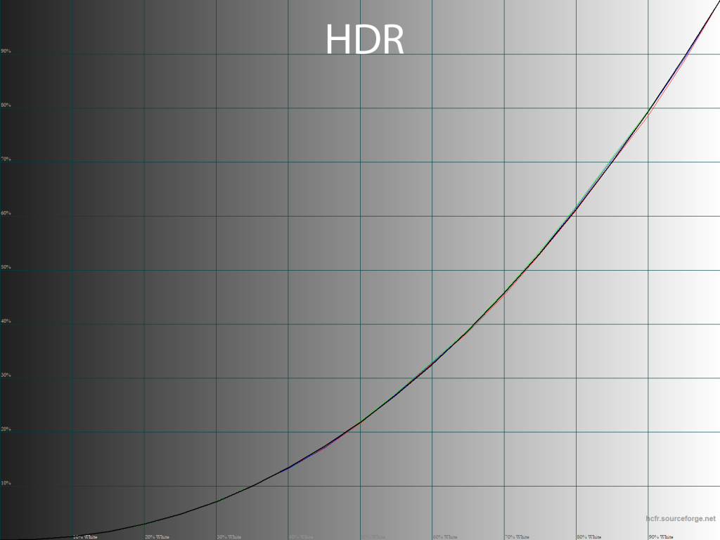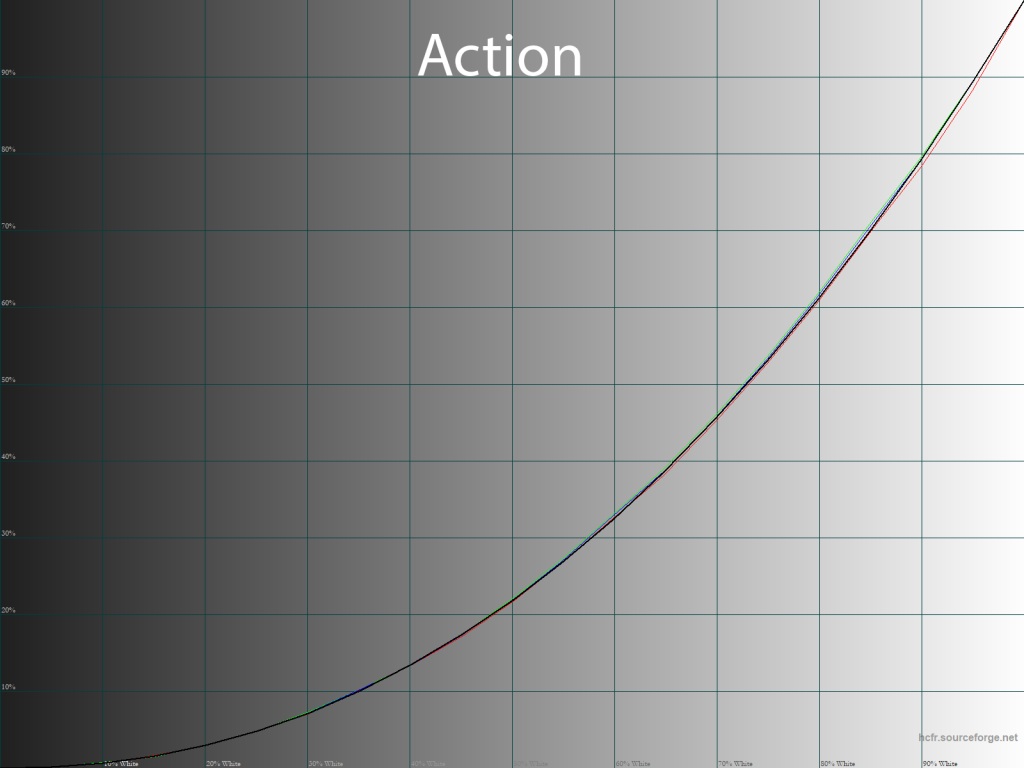 Пресеты HDR и Action отличаются по настройке точке белого и расположению точек чёрно-белого градиента на CIE-диаграмме, однако, по гамма-кривым они вылитые Standard Mode. Впрочем, тут надо уточнить, что HDR Mode при выводе соответствующего контента будет вести себя несколько по-другому.