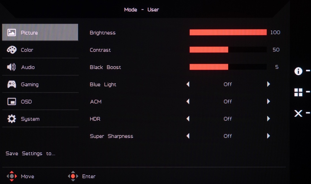 У монитора Acer нет каких-либо встроенных датчиков (освещенности, приближения), но в меню есть достаточно большое количество дополнительных параметров, напрямую влияющих на точность цветопередачи и качество картинки в целом. Для оценки их влияния мы выбрали два основных: Gamma и Black Boost.