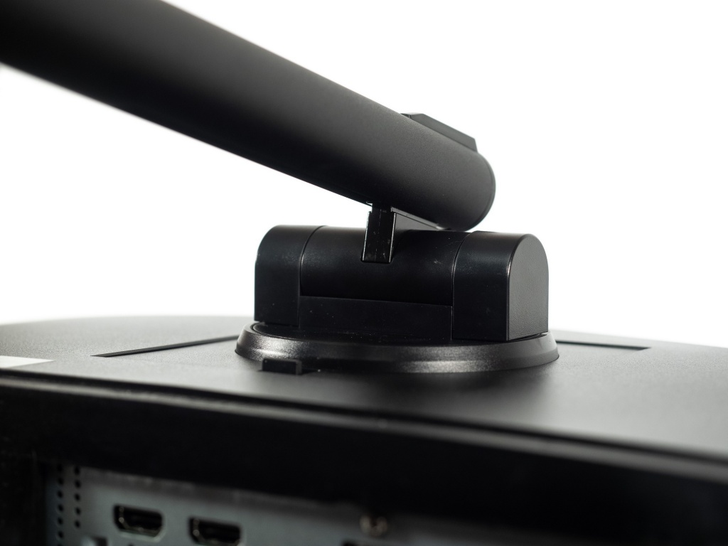 Основное изменение внешнего вида приходится на подставку, которая представлена в виде круга со скошенной к пользователю поверхностью и креплением центральной стойки, смещённым к задней части. Сама центральная стойка удивительно изящная и тонкая, выполнена целиком из металла, окрашенного в чёрный цвет. Используется быстросъёмное соединение с корпусом без необходимости использования стороннего инструмента. Есть и поддержка VESA-совместимых кронштейнов стандарта 100 х 100 мм, а вот система прокладки кабелей отсутствует как факт.