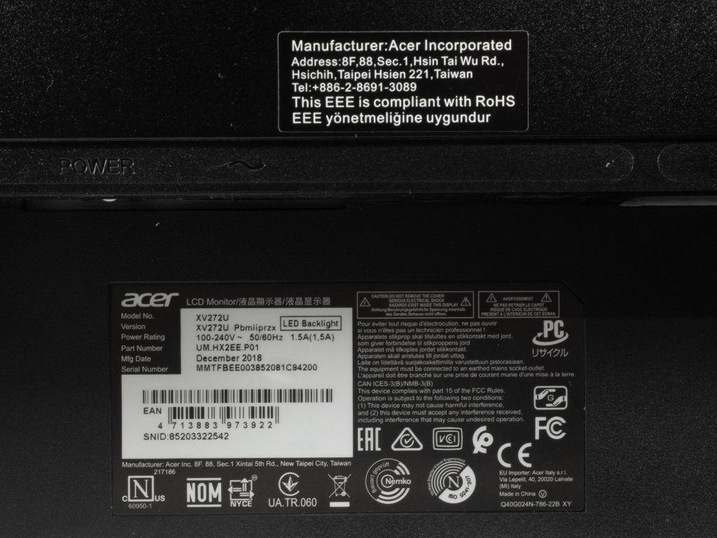 По одной из наклеек можно узнать основные технические характеристики продукта, место (Китай) и ориентировочную дату (декабрь 2018 года) сборки нашего экземпляра. Монитор производится непосредственно силами самой компании Acer, без привлечения сторонних подрядчиков (не считая производителя матрицы).