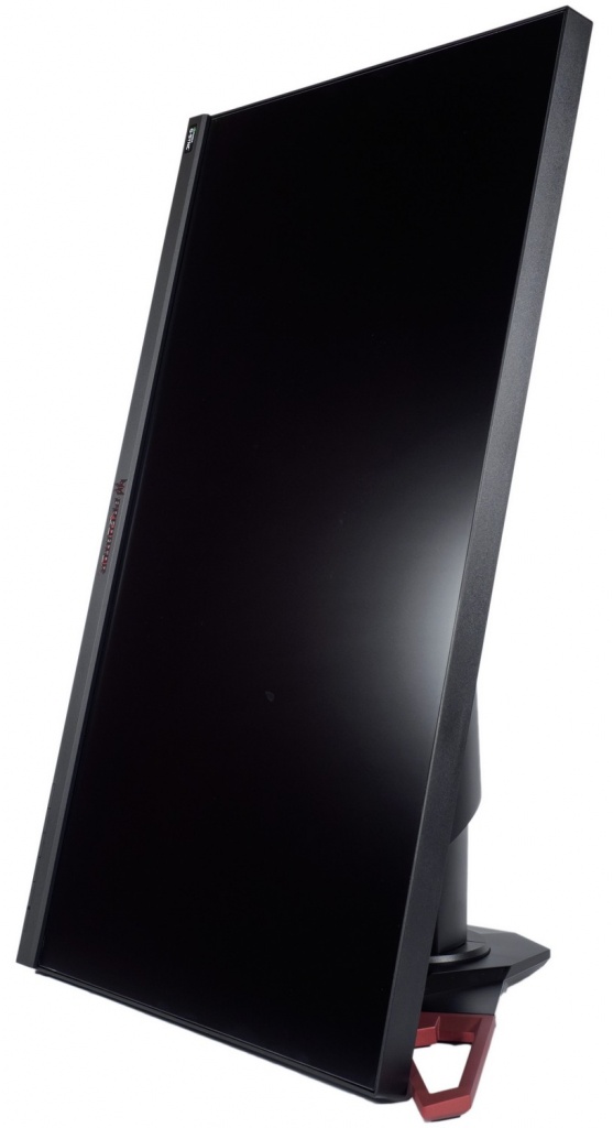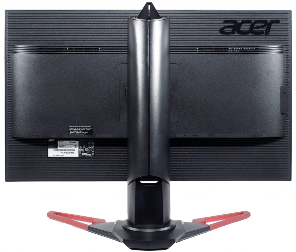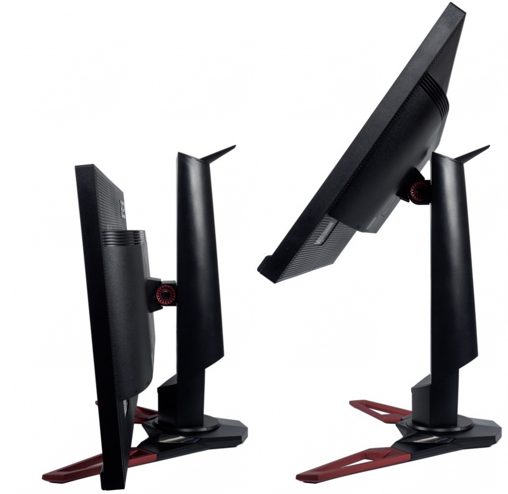 По сравнению с первыми поставками героя обзора в последней ревизии дизайнеры слегка обновили внешний вид, приведя монитор к общей стилистике всех игровых новинок Predator конца 2016 года. На центральную колонну добавили «крючок» и… этого оказалось достаточно. «Безрамочность» корпуса никуда не делась. Эргономика подставки – максимально широкая. Доступен наклон, поворот, изменение высоты установки корпуса и переворот в портретный режим (Pivot). Присутствует VESA-совместимое крепление стандарта 100 х 100 мм. Цвет корпуса – чёрно-красный, со вставками из сероватого пластика.