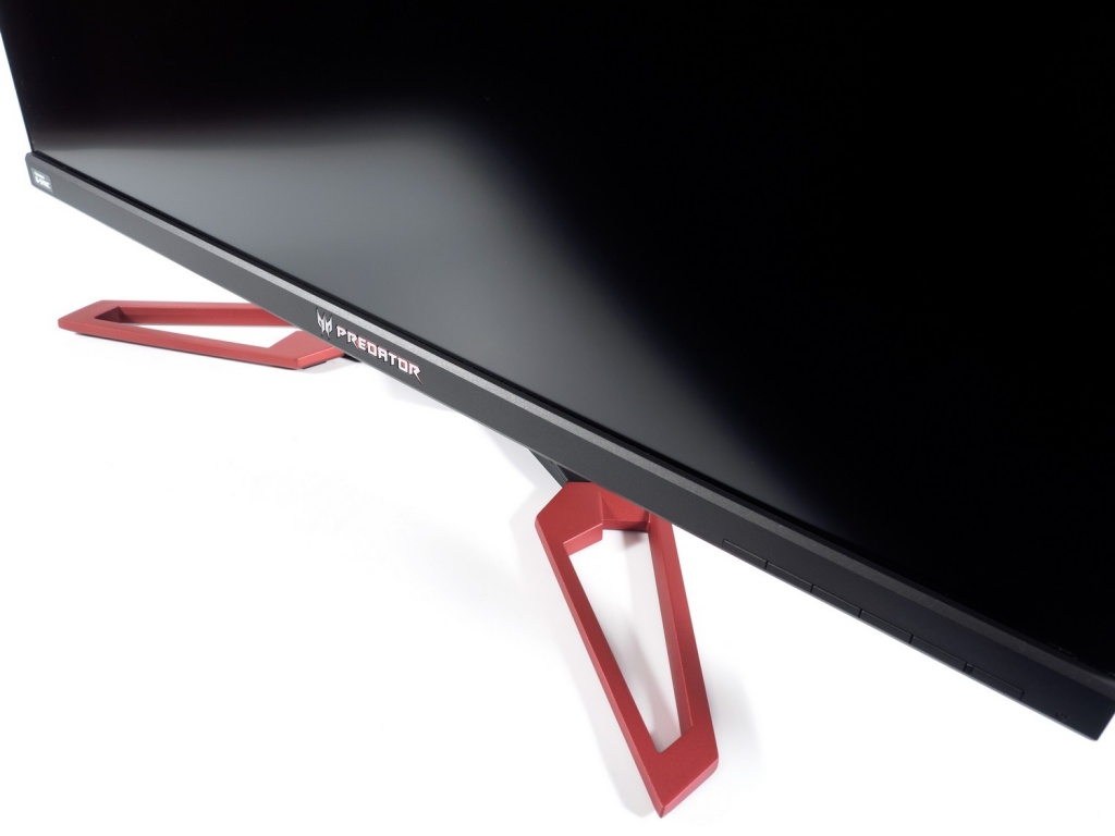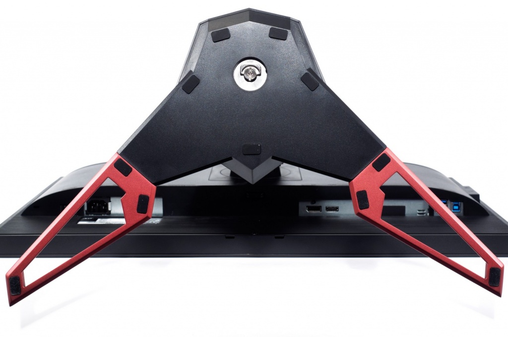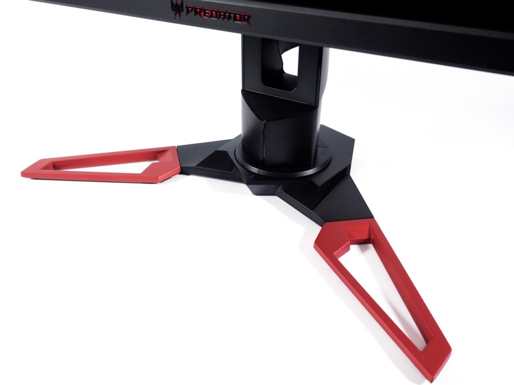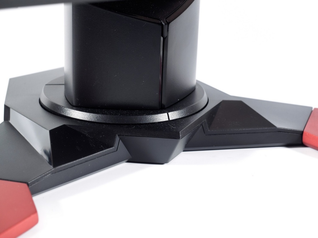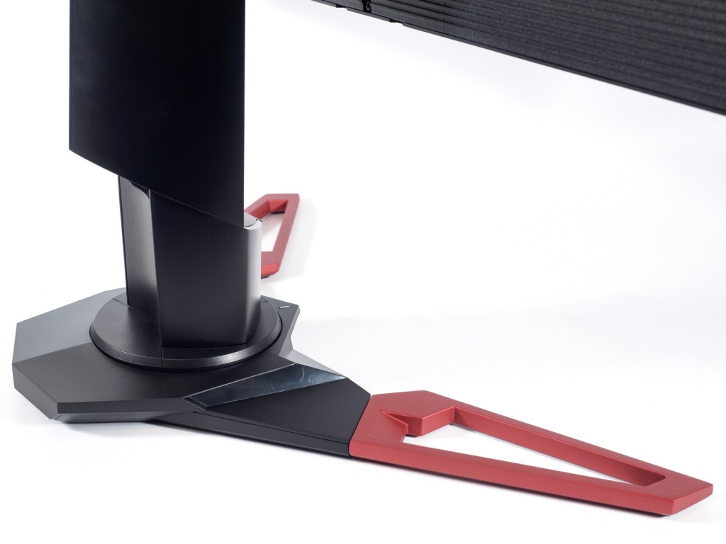 В нижней части нас ждёт знакомая некоторым читателям по другим моделям Acer Predator чёрно-красная подставка, напоминающая по форме ножницы. Она довольно глубокая и занимает достаточно много места. В её центре расположился специальный механизм, обеспечивающий монитору возможность поворота вправо-влево на 45 градусов (а не 30, как у некоторых).