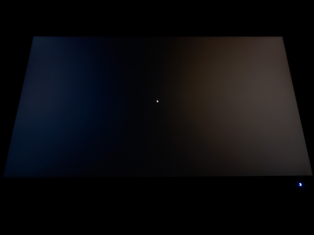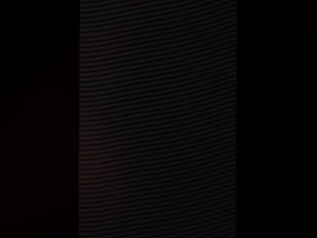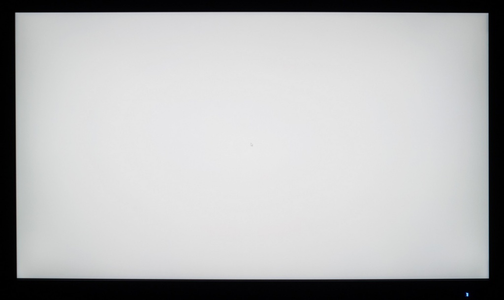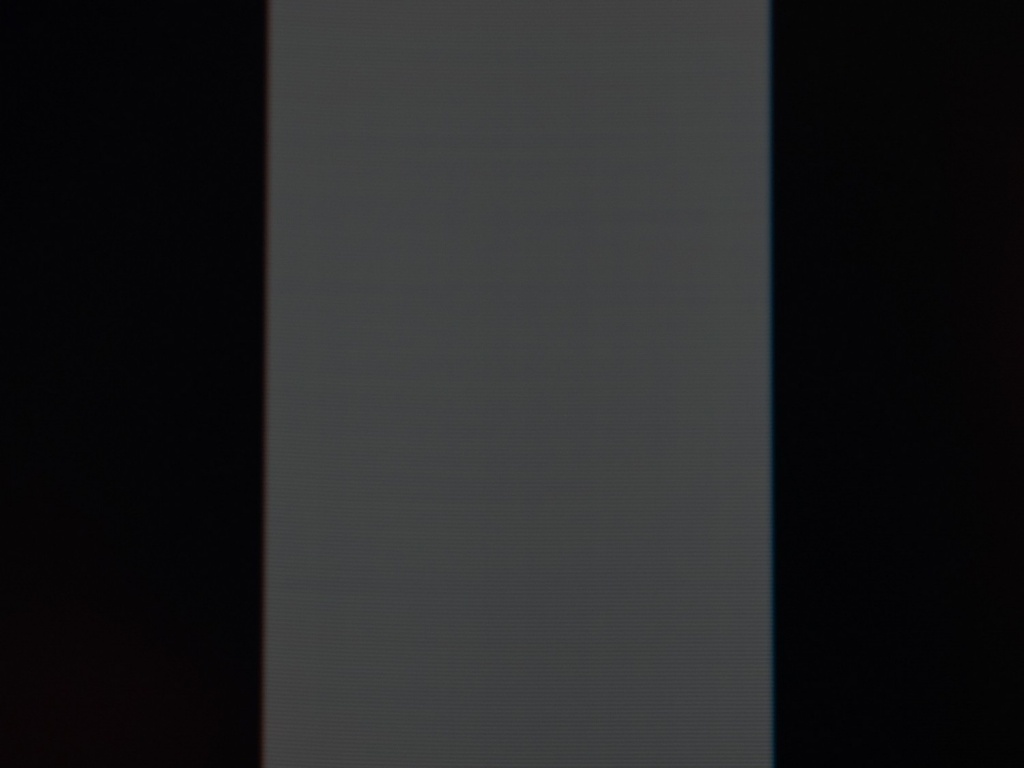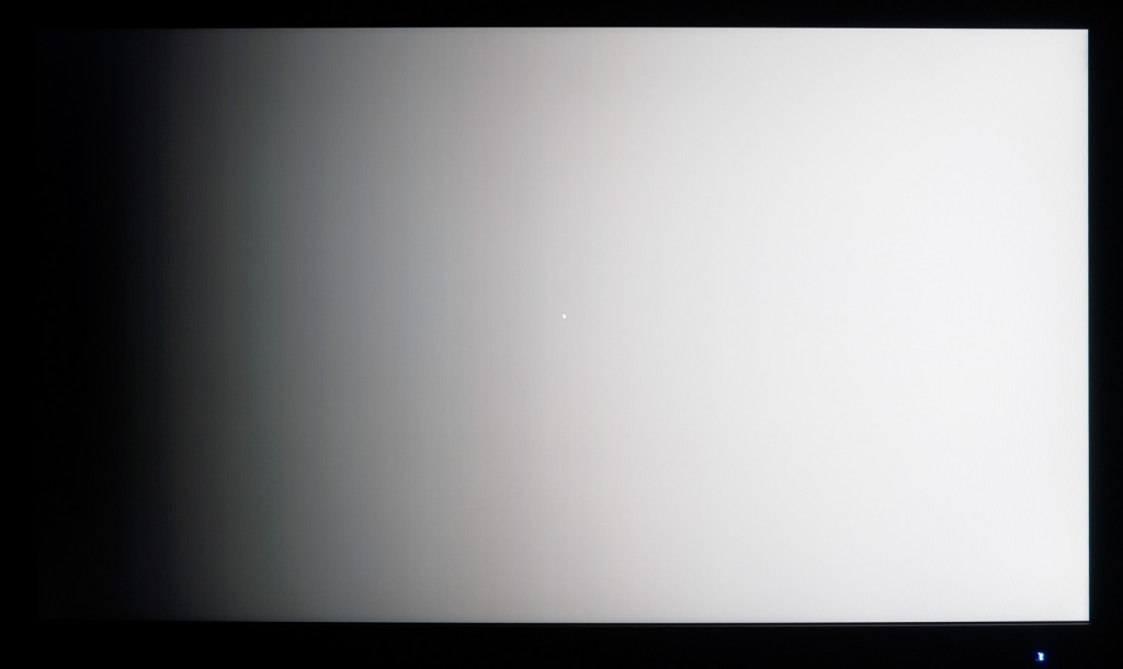 Фотография выше демонстрирует белое поле с минимальными коррекциями в графическом редакторе для более наглядного представления происходящего на экране с точки зрения равномерности светлого поля. Ярко выраженных проблем с равномерностью ЦТ мы не видим, за исключением слегка затемнённых крайних участков матрицы.