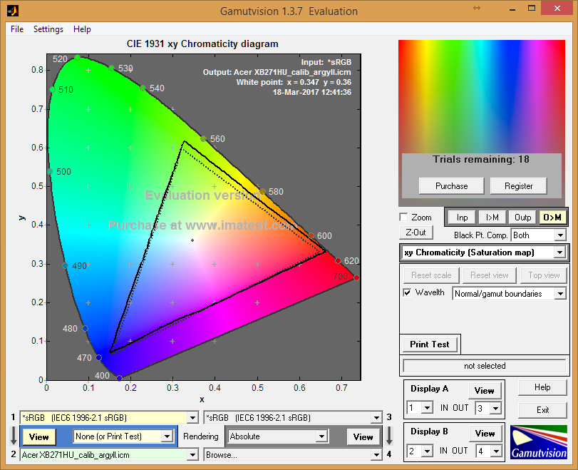 В таком состоянии монитор Acer Predator XB271HUbmiprz с лёгкостью смог получить сертификат соответствия стандартам UGRA и пройти аттестацию по четырём основным цветовым пространствам, что является нормой для W-LED подсветки и высокими результатом для игровой модели. За моделью спокойно можно работать с цветом (на любом уровне, если вам достаточно пространства sRGB) и не знать проблем.