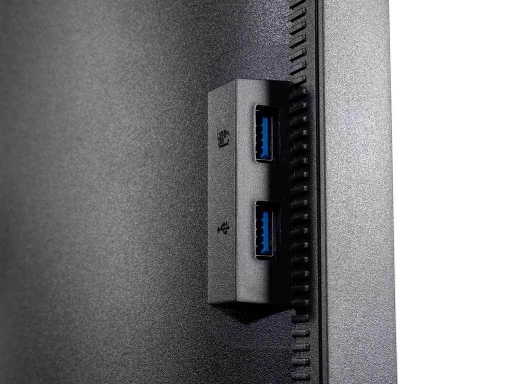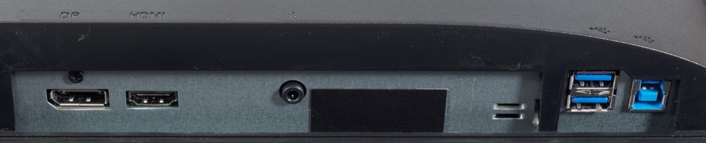Основных интерфейсов для подключения два: DisplayPort 1.2 и HDMI 1.4. Последний ограничивает максимальную частоту вертикальной развёртки, не позволяя выйти на уровень, указанный в ТХ монитора. Для работы с периферией предусмотрено 4 порта USB 3.0. Дополнительно установлено простенькая акустическая система с двумя динамиками по 2 Вт каждый и один аудиовыход 3,5 мм для подключения наушников или внешней акустической пары.